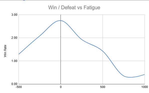 For reference, Fresh goes from -500 to 0, while Low goes from 1 to 399. I didn't test the number 600, which is when it starts to show "Rst" icon ( "Fatigued" ), but I assume it reaches minimum performance around that value.