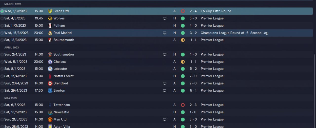 Version 7.1 of this tactic 4-2-3-1 with the AM on the right side. Won a treble with City and a red card in the UCL final preventing a quadruple. Haaland's broken foot led to him missing a 1/4 of the season which affected the overall league points.