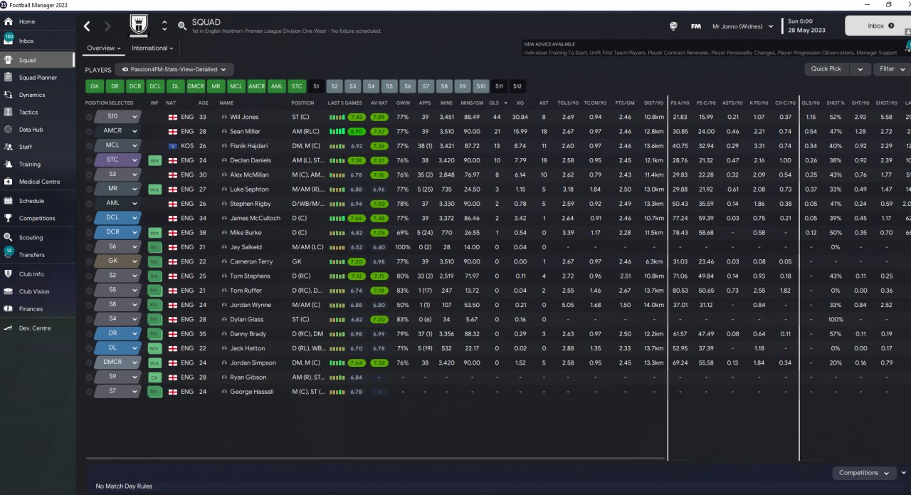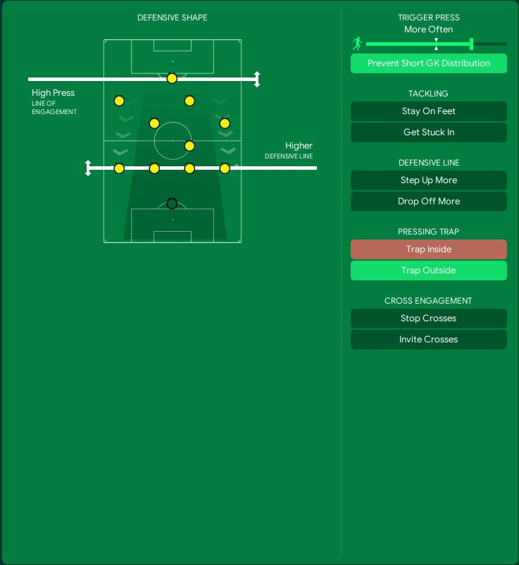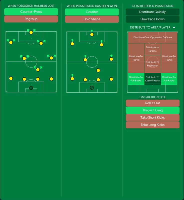 GK - No added instructions, default to SK support. FB right Defend - Shoot less often only. BPD's (both identical) set to cover - No added instructions. FB left support - Shoot less often. DLP support - No added instructions. CM attack - Shoot less often / move into channels. Winger attack - Shoot less often. AM attack - Shoot less often / move into channels. IW attack - Shoot less often. AF attack - Shoot more often.
