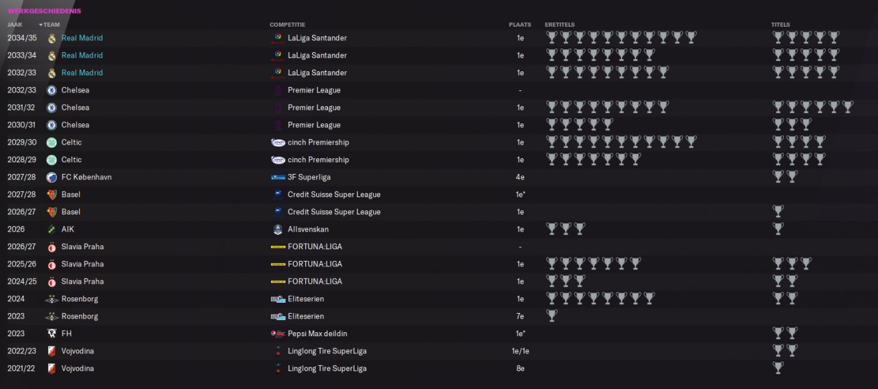 A career stretching over almost 15 years, over 750 games played, accross 10 clubs/leagues. Just gotten 1ste place in the hall of fame winning: 4x CL, 2x EL and 13 league titles. Can recommend this highly to everyone!