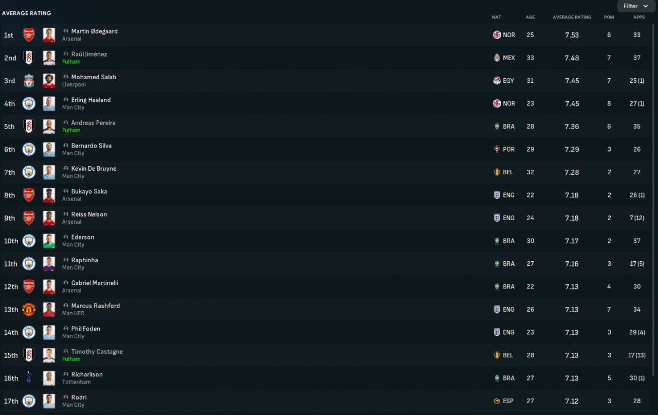 This tactic, as the name suggests, relies on beating your opponent harder than he can beat you. It has great synergy with this years meta. I would say it works better on bigger teams, since pressing-attacking football is more suited, but as you can see from my example, it made Fulham much better than expected. I holidayed the whole season, no transfers, no staff changes, only tactic and set piece routine. Fulham scored the most goals (by far) even when the players are nowhere near the firepower of Manchester City or Liverpool. On xG we were even better. You can see the players having some of the best average rating in the league, as well as some of the top goalscorers.