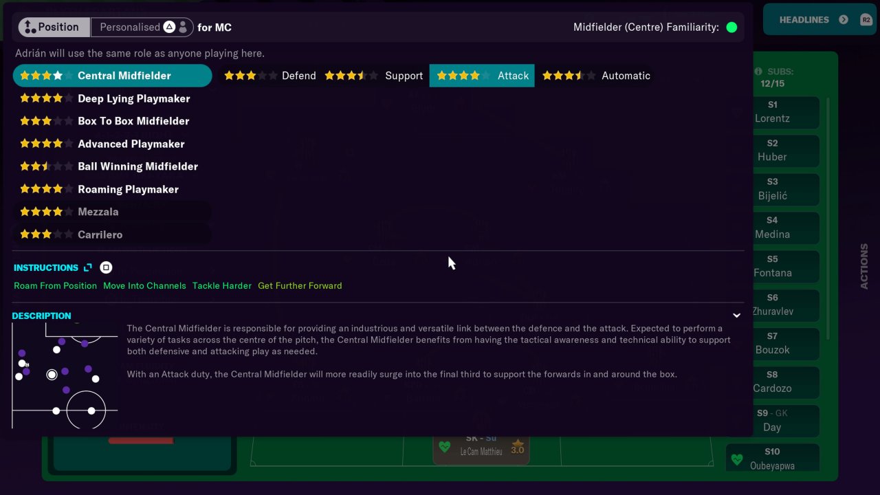 The Central Midfielder: Roam, move into channels Also, this position is instructed to swap positions with the LCM position