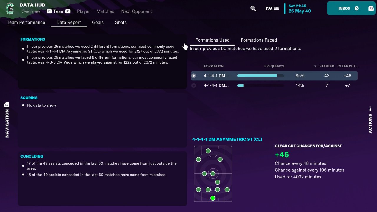 Here's the details of my last season, in which I used the primary formation (right wingback) 43 out of 50 matches (85%)