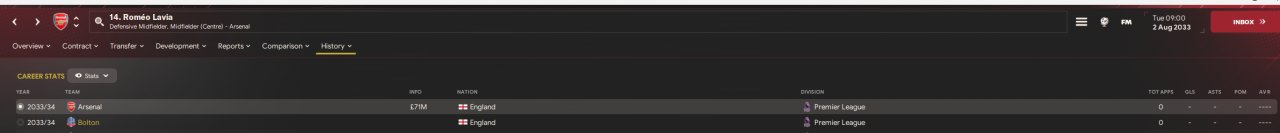 I recieved some bids but I accepted the highest bid of 45m from Arsenal and rejected the others. I then offered Lavia out again at 46m, a bid of 46m came in, I accepted and then cancelled the Arsenal bid. I then offered Lavia out again for 47m. Arsenal once again made a bid. I accepted and cancelled the other bid. I once agained offered Lavia out for 48m and yet again another bid came in. I repeated this process for about a week until the "new" bids stopped coming in.