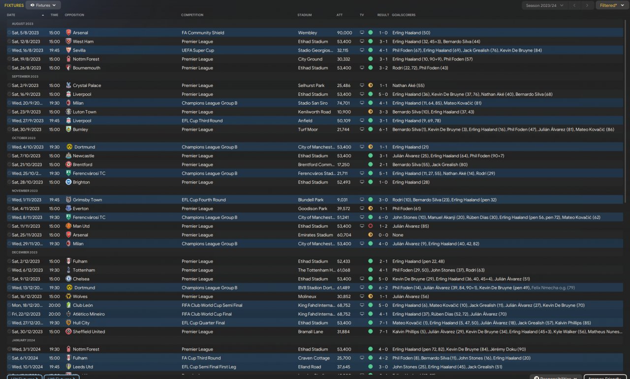 Won the league and all other trophies, Haaland 83 goals in all comps. I set Haaland in the AF and went on holiday for the duration of the season. 2 defeats in all comps!!!
