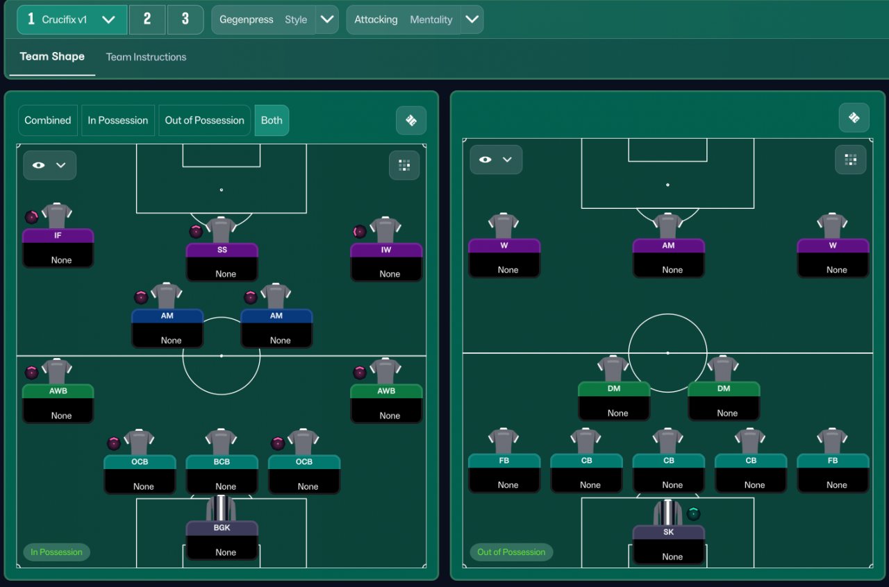 GK - tackle harder AWB - sit narrower, shoot less often, take more risks, cross from byline, tackle harder OCB - shoot less often, tackle harder BCB - tackle harder AM - move into channels, take more risks, tackle harder IW - sit narrower, tackle harder SS - dribble more, tackle harder IF - sit narrower, take more risks, tackle harder