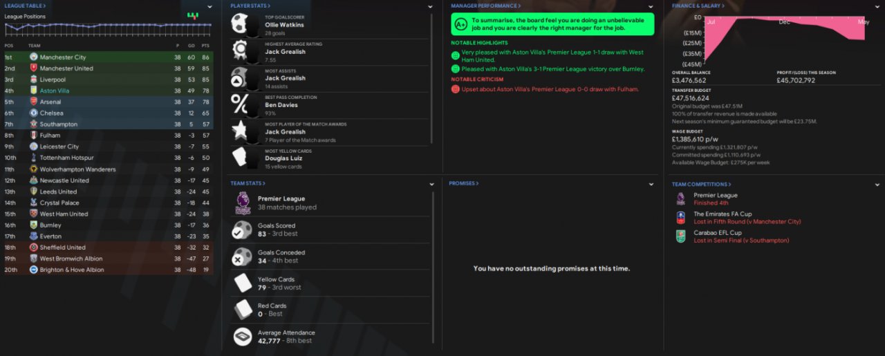 5th place finish with Villa and an FA Cup, Watkins with 38 goals