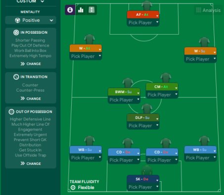 Had success with this using Villa, Its a 433 but with no midfield or strikers, WBs have get further forward and cross from byline added to ensure they get up the field as much as possible when they have the ball, effectively trying to make the WBs more winger esq