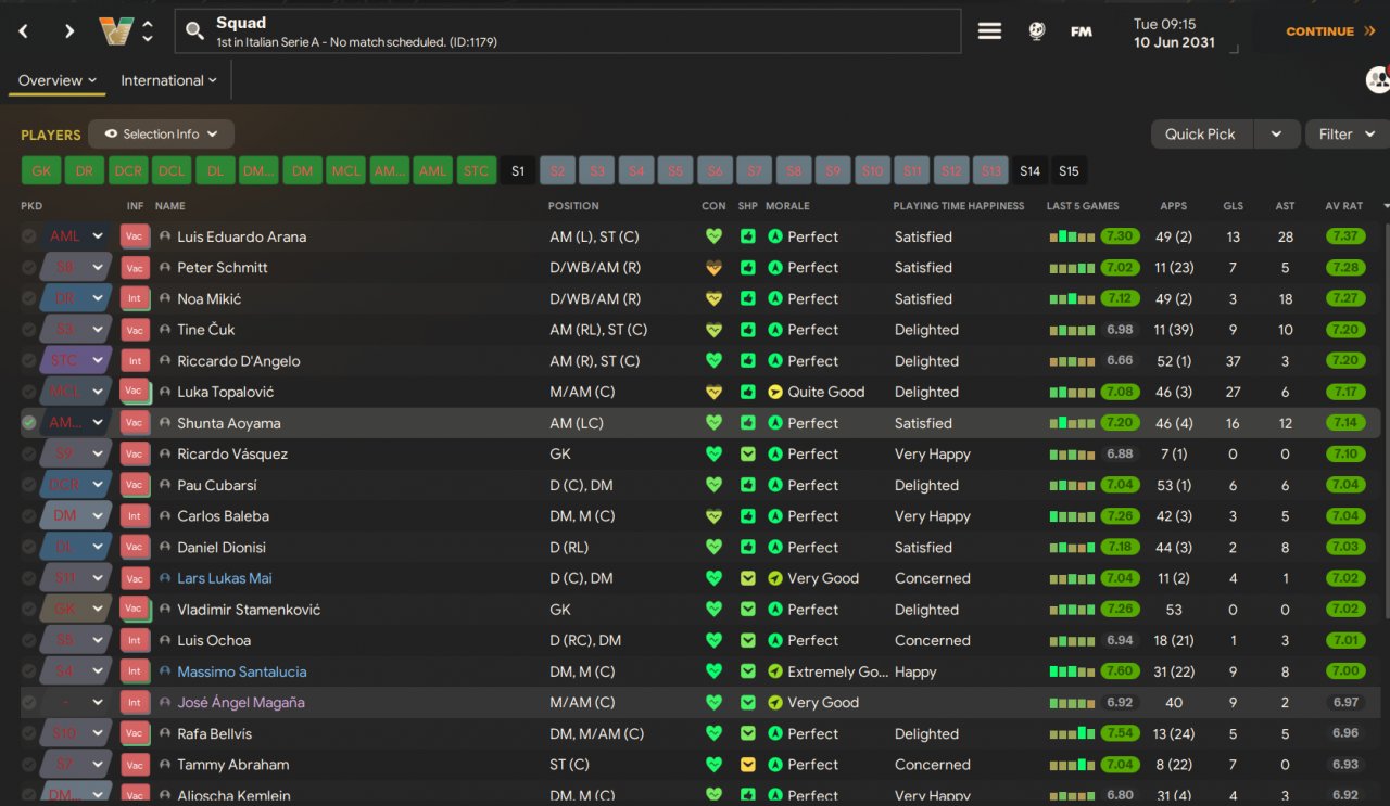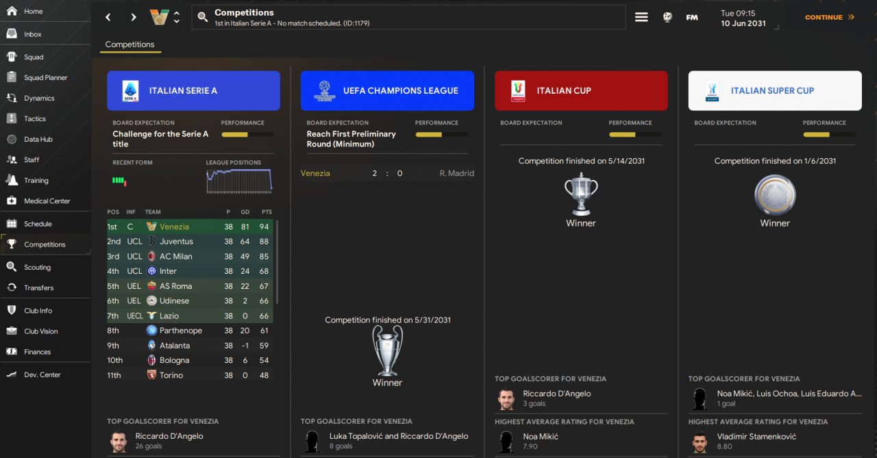 I used this tactic to win the quadruple with Venezia in my 8th season. This was my first year using this tactic. The main idea is to overload the center and left side of the pitch which allows the RWB to have constant free runs at the defense. There is a lot of flexibility in the attacking movements of the players, with roam from position on 4 players. The only player instructions are for the AP (Dribble More, Roam from Position, and stay wider).
