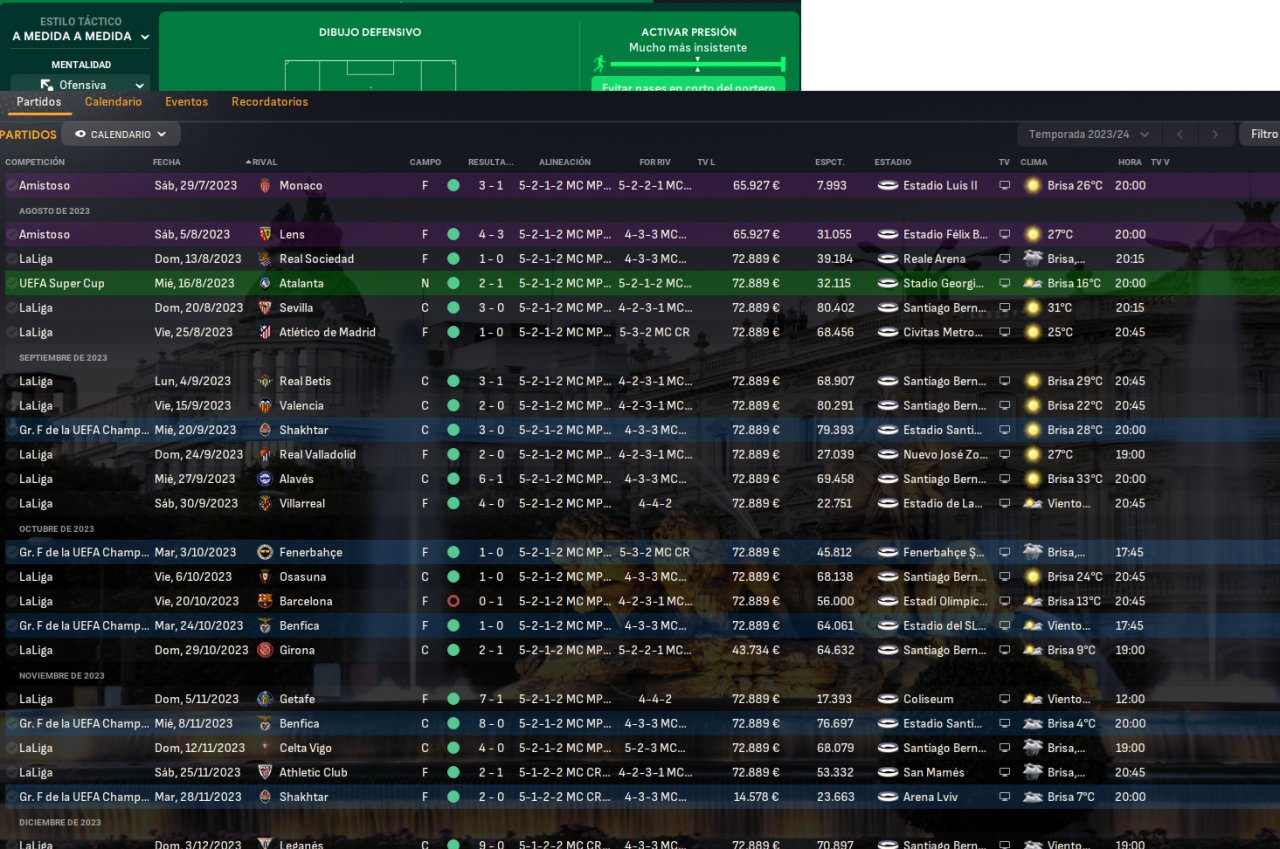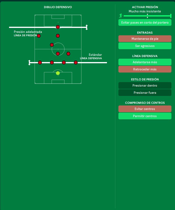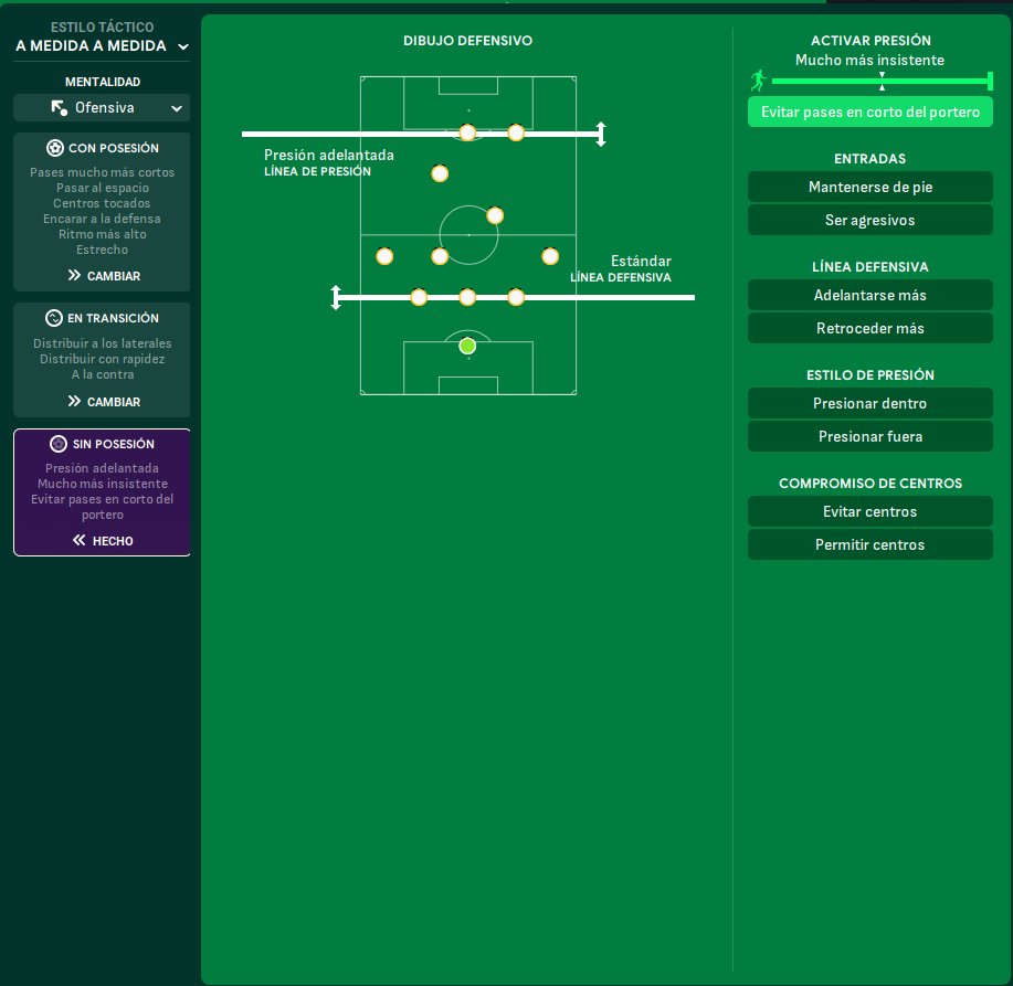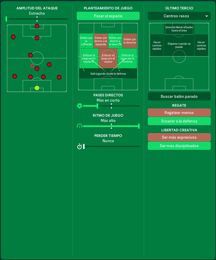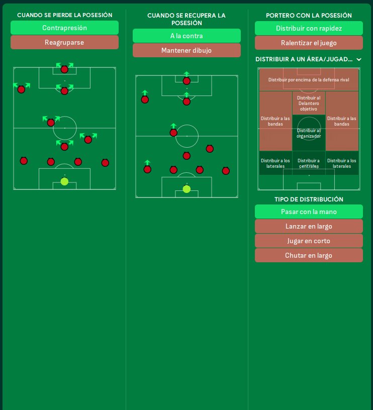Close game, high pace, somewhat short passes, based on the surprise between the lines of the second midfielder and the left winger who moves inwards. With high pressure and play on the counterattack. And standard defense block so that they do not hurt us in space.