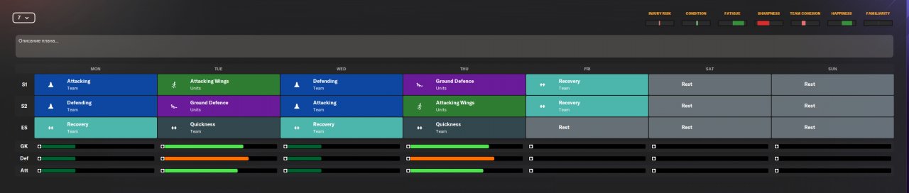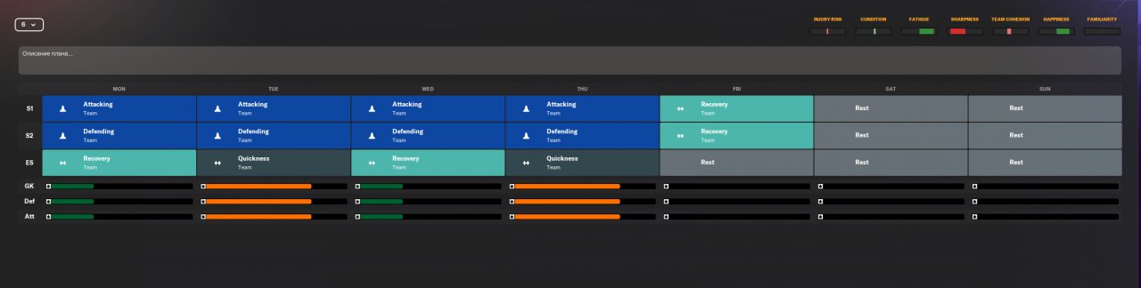 Based on this data, I decided to compose a training that should realize the potential of a player at 100% or close to these values. The results are sterile because there are no 2 matches per week, no 3 matches per week. Players do not leave for national teams.