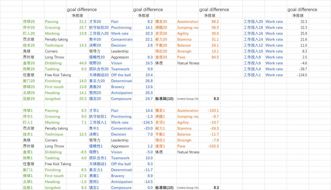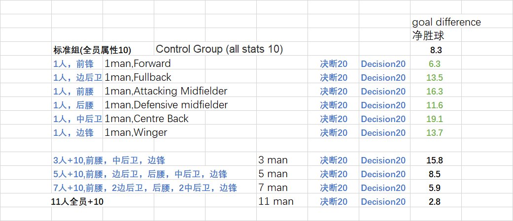 Next, each test independently improved one position, full-back, forward, back, centre-back, wingers, decision increased from 10 to 20, goal difference increased (13.5,16.3,11.6,19.1,13.7). Only the striker is slightly down(6.3).