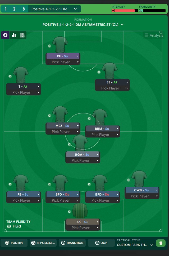 I want my team to use “Roam from Position” to create unpredictable movements and fluid, intuitive passing patterns that constantly disrupt the opponent’s structure. My two ball-playing centre-backs should actively contribute to the buildup with progressive passes, while roles like the Mezzala and Box-to-Box midfielder open up dynamic passing triangles across the pitch. How can I best set this up so that this controlled flexibility shows through both in possession and during transitions?