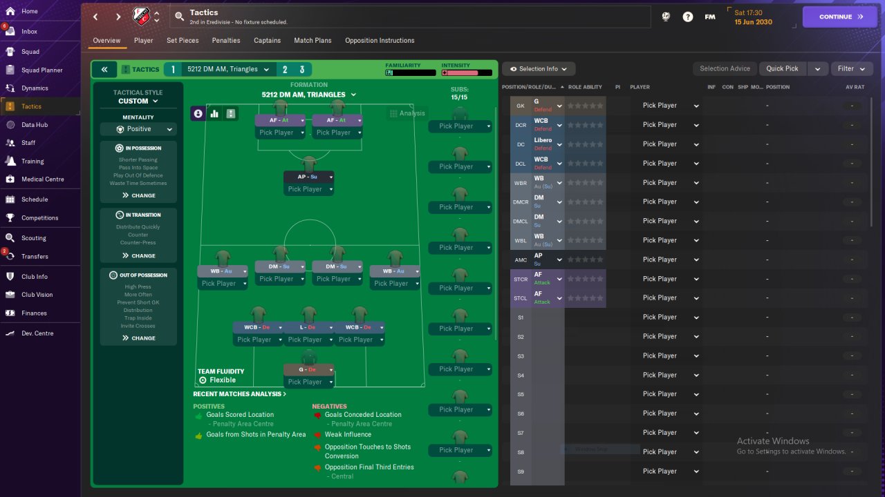 5212, does what it says on the tin. Makes Triangles. There is a heavy focus on player rotation, and freedom of movement, there always seems to be a free man. I only use 3 personal instructions. The AP on roam, and the wing-backs on stay wider and Cross more often. The wing backs often stretch the play and will find themselves free to run to the by-line or charge late into the box alone. After experimenting last season, the two AFs really occupy the back line and create space for the DMs and AM to move and pass. On several occasions the AM and one of the strikers swap causing chaos in the defense.