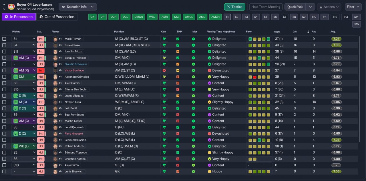 Out of possession: A structured 4-4-2. Nothing new here, just the usual aggressive tackling meta. In transition: A dynamic 3-2-3-2. The left full-back acts as a defensive midfielder, allowing the actual DM to push up into the attacking midfield area. In the final third: An offensive 3-2-5. On the left side, the DLF, AM, and PWB form an unpredictable triangle.