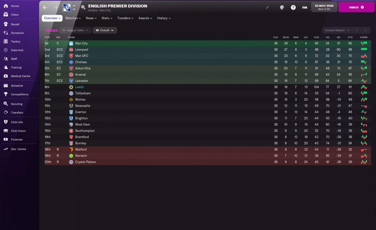 An editor was used before the season started to make the team familiar with the tactic and to heal the squad to start the season fresh. I then went on holiday until the end of May with nothing else being touched.