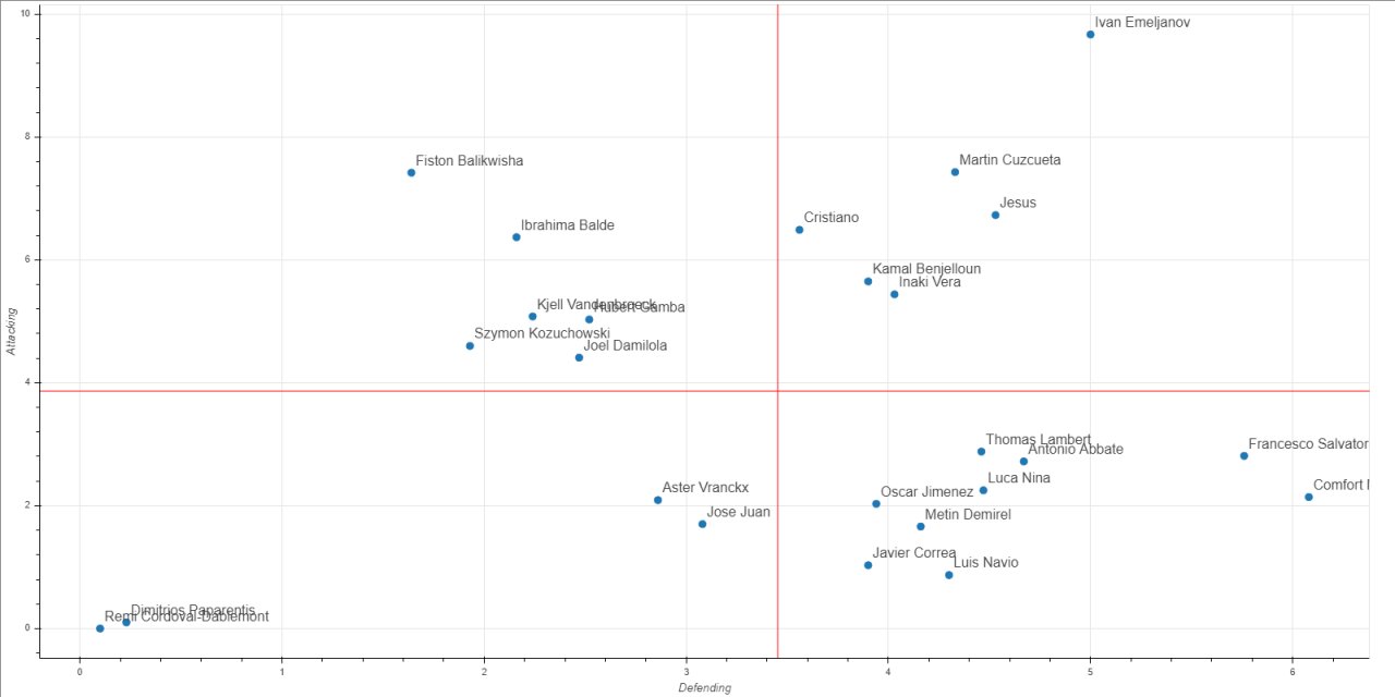 The lower right are above average defending and below average attacking. These are mostly the back 4.