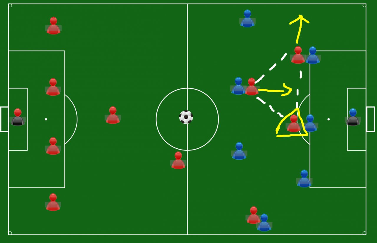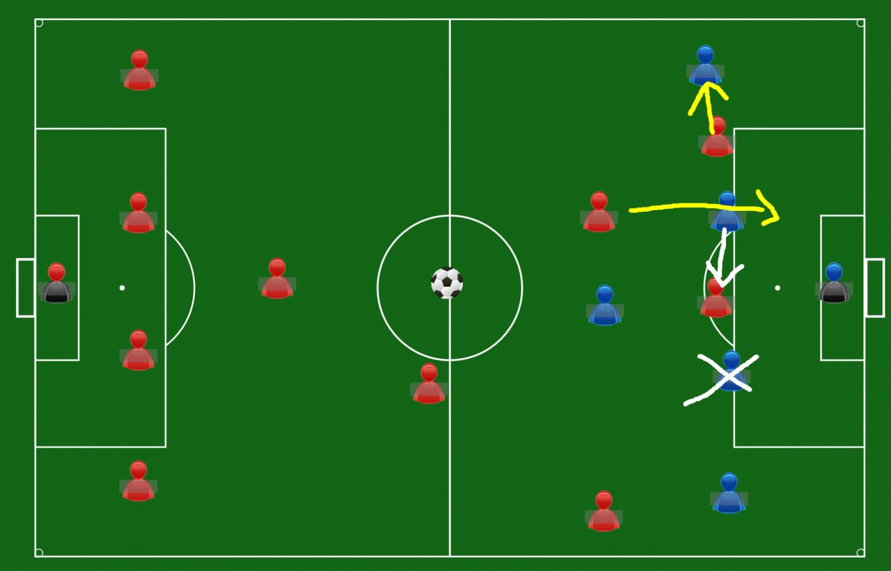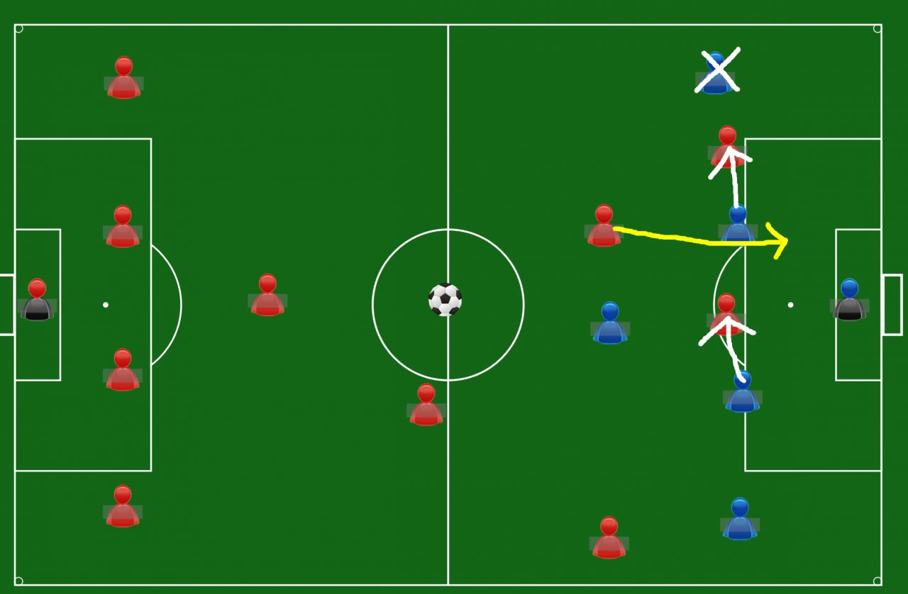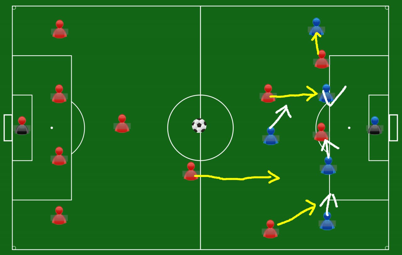 The tactical idea is mainly local advantages. In the process of defensive marking, the opportunity for two defenders to exchange marking or miss marking: