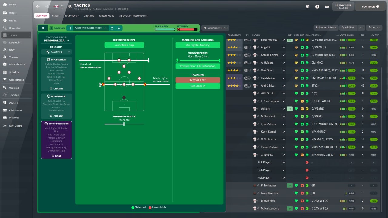 This is not a ball possession and match control tactic. It's a collective team work based tactic, that will makes you smash your opposite using physical and mental power, with an extremely concrete and aggressive football. Offside trap, extreme pressing, fast direct passes and flanks crosses are the key words of this game system. Good Luck
