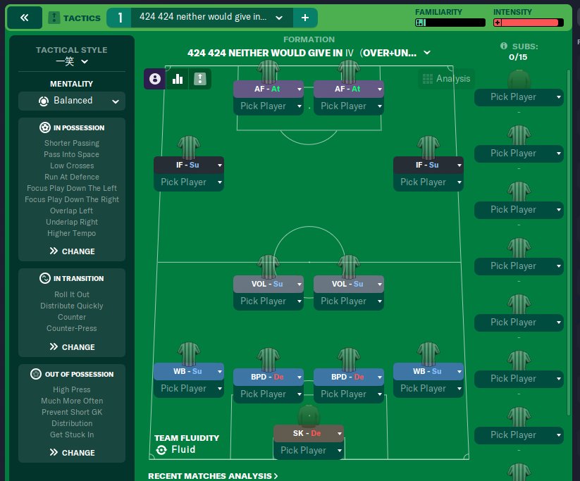 424 is a really good formation for the current engine, it has been studied to the extreme, and there are many almost duplicate works. I did a test where I used the regular IFS+WBS+VOLS combination, which combined reduced shots and risky passes to create different offensive panel Settings with the same effect. In my limited testing, there were four different Settings and it was hard to tell which was better. These four tactics are just different ways of attacking, and with a bit of luck, I think they'll be able to compete in 1,200 games. Of course, it's better to be able to compete in 4,000 games, so there's less error. I'll be interested to see how that turns out. I'll make my own prediction. They should both be 51 points or 52 points. (The difference of the 4 tactics can be seen through the names of tactics, switching between overlap and underlap, or choosing none at all.)