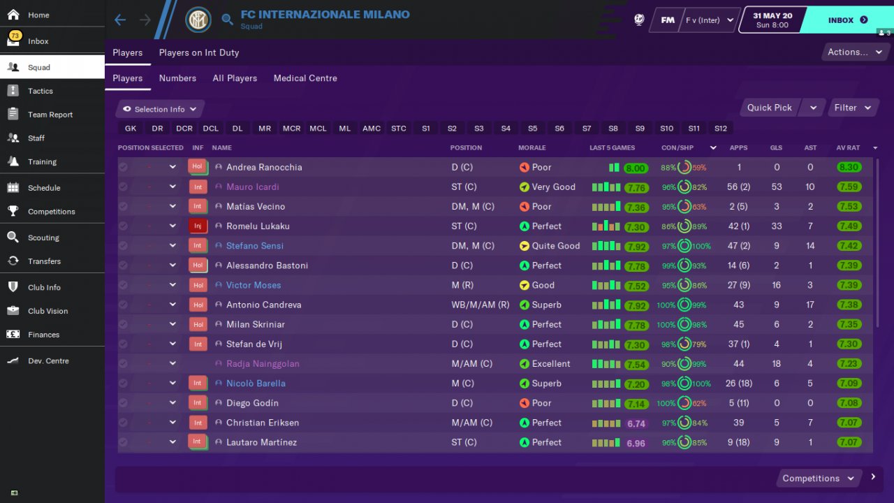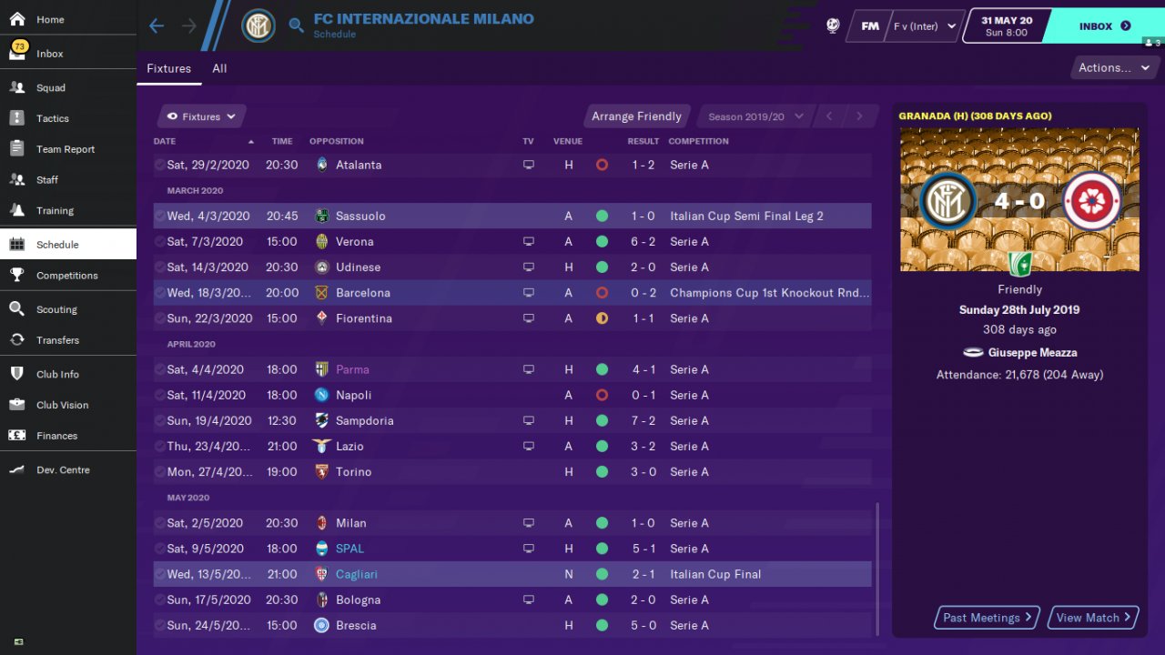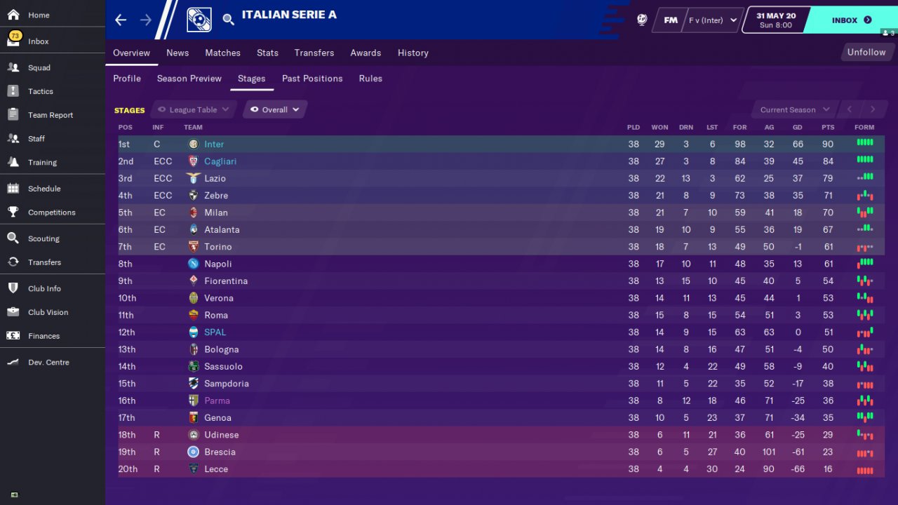 Countless trophies are won thanks to the complete striker who backs the team alone. Test teams 1-Inter 2-Cagliari 3-Spal . Inter finished the serie A tournament as champions. Cagliari is ligi2.he went on to the Champions League, finishing in line. Spal is 12th in the league.he topped expectations by finishing in line.