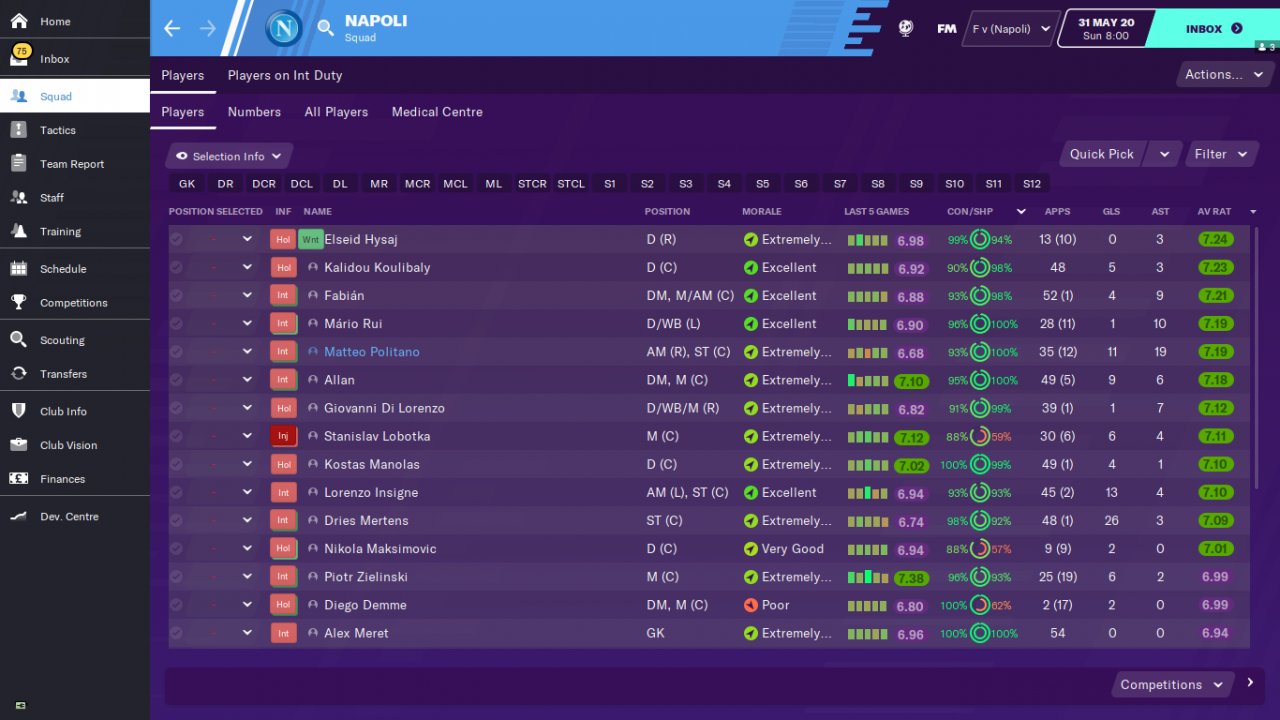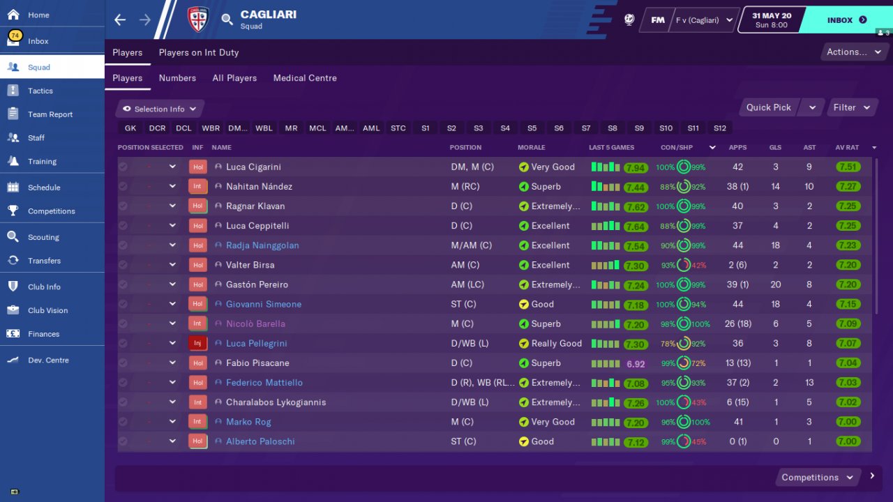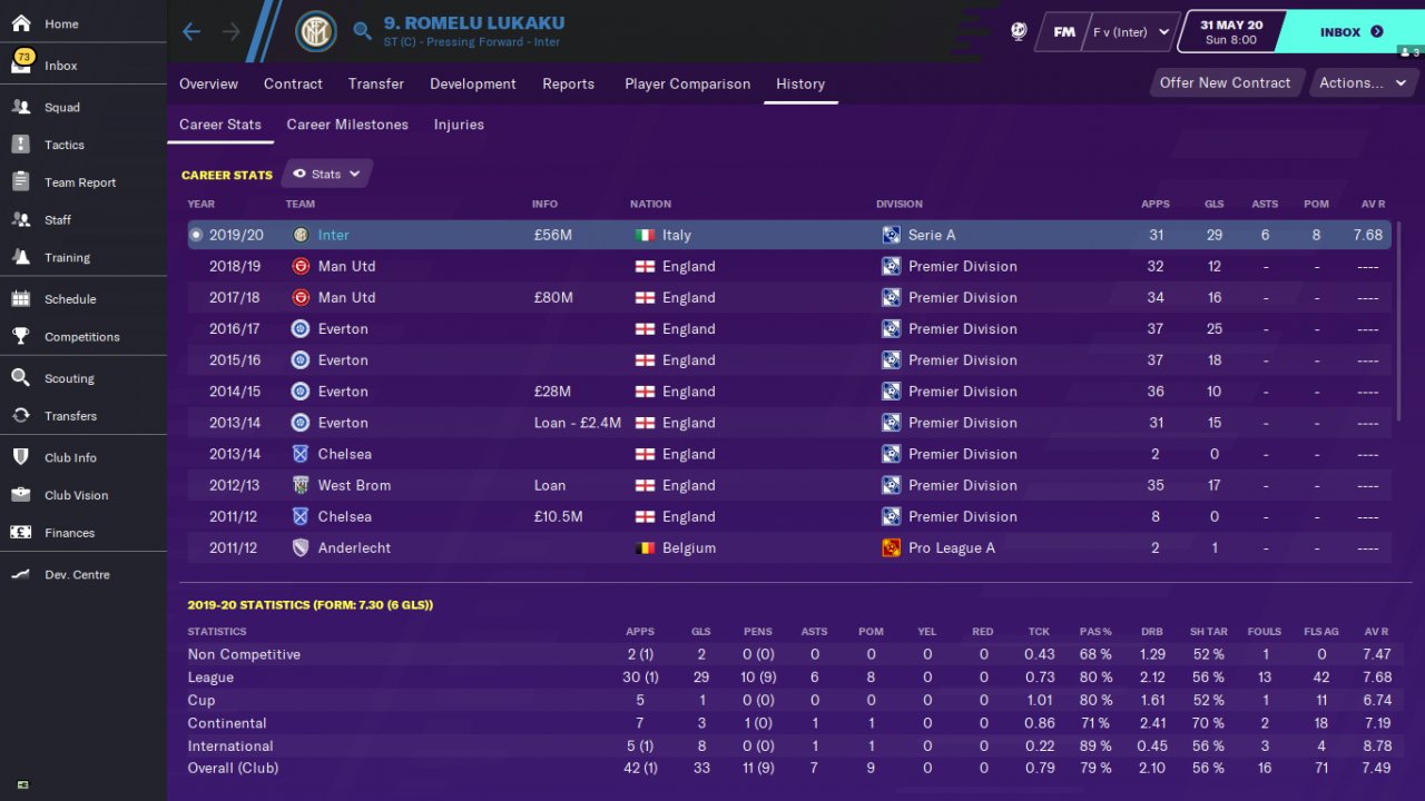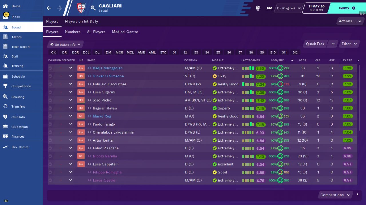 Countless trophies are won thanks to the complete striker who backs the team alone. Test teams 1-Inter 2-Cagliari 3-Spal . Inter finished the serie A tournament as champions. Cagliari is ligi2.he went on to the Champions League, finishing in line. Spal is 12th in the league.he topped expectations by finishing in line.