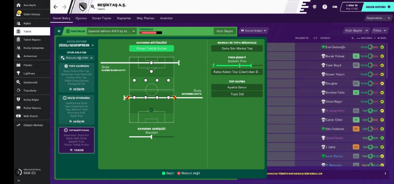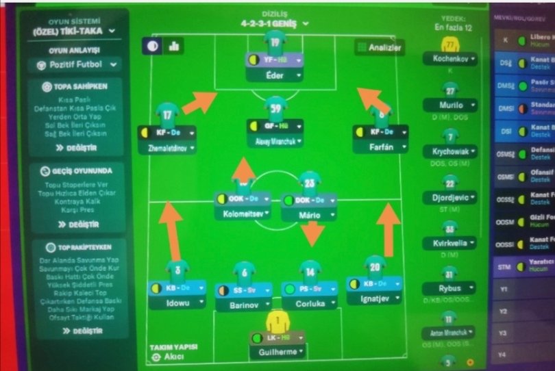 First of all, we play an offensive football. Our expectations will go forward and support our wing players. One of our wings will be the reverse-legged wing and it will fold in constantly and the wing behind it will fill these gaps. On the right wing, the wing back will take the position ahead and the defensive midfield player behind the midfield will close. In the future, two creative strikers will be able to pursue goals both in the middle of the wings and in counter attacks. Our stoppers will be passers and we will get out of the defense by passing. Our defense will be set up ahead and we will use offside tactics to avoid scoring a lot. We will create a hard defense form with the ball command. In the standing balls, our stoppers will go forward and look for goals. We will constantly overwhelm our opponents with wing raids. Two-way midfield (box to box) player will start counterattacks and create a single goal goal opportunity for creative forwarders. Our defensive midfielder will be almost insured in the defenses ahead of our right back. Our goalkeeper is a libero goalkeeper to get the balls hanging from the back.