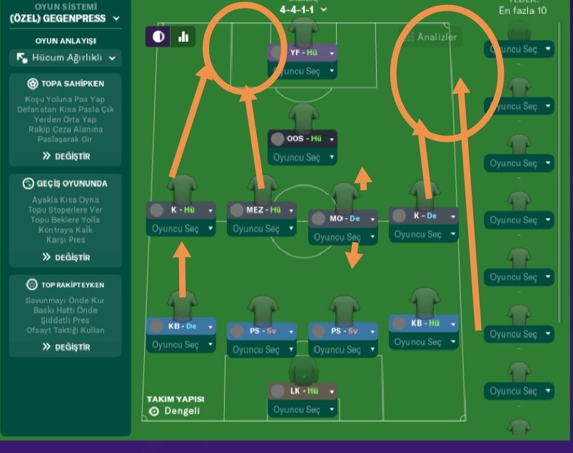With this tactic, we enter the penalty area by playing from the vertical wings. If our midfielder wing on the right wing is the support of the right back, we will do a lot of thrusting on the right wing so that we can attack. Our midfielder on the left wing will act as an attacker and try to complete the middle from the thrusts on the right wing within the penalty area. Our offensive midfield will lead the attacks and create assists and goals with vertical passes. Therefore, we gave our offensive midfield instructions to take more risks and play vertically. Our left-handed mezzala player will look for goals in and around the penalty area, along with the left-wing attack player. Our creative forward will cover more dribbles, thereby saving other attacking players. In order to be a more active and challenging team, most of our players were instructed to be harder in the interventions. Due to the wing-weighted game we play, our stoppers will stand out in the crowns and corners we will win and seek goals. I ask you to test this tactic, which brings success to every team regardless of the big or small team, for these reasons. It would be very exciting to see a very different style of 4-4-1-1 in the middle Thanks to the webmasters and everyone else.