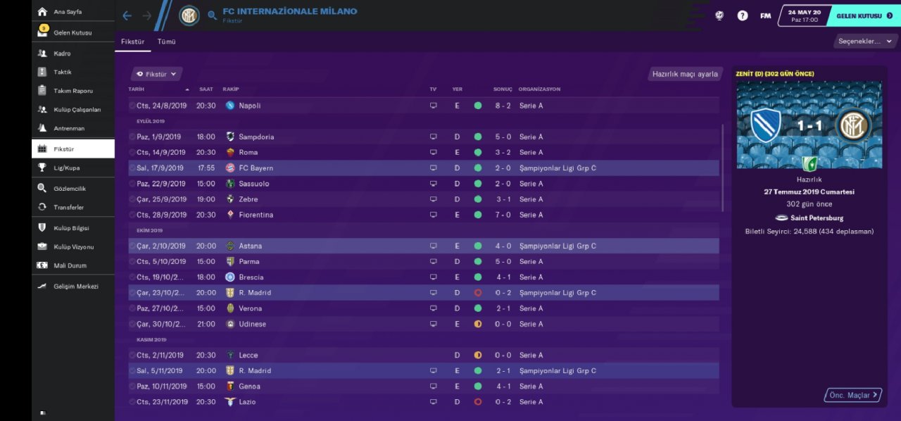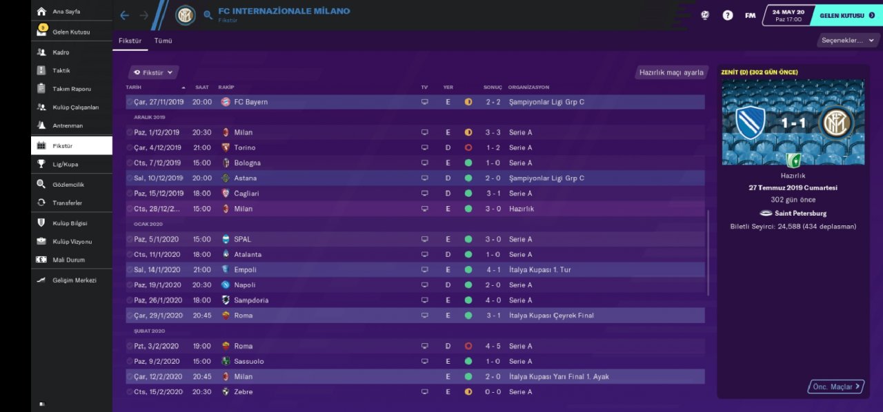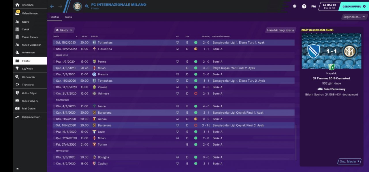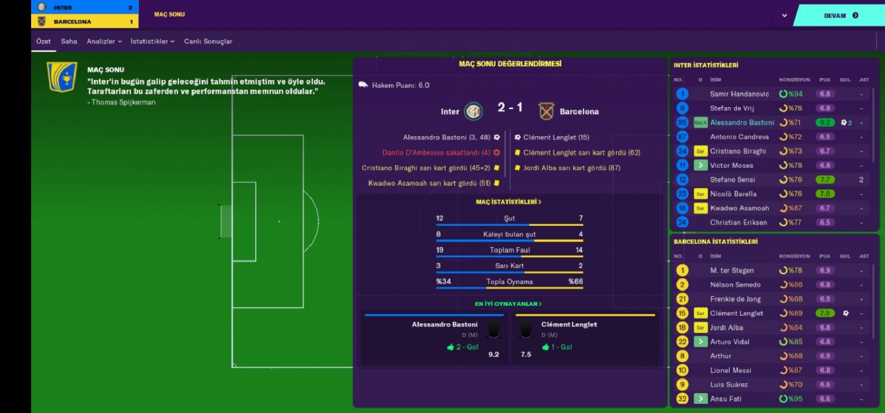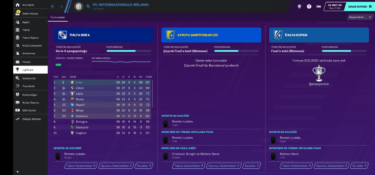 Hello everyone, regardless of your favorite undertog team, I am here with a tactical game that has an incredible victory percentage and an extremely abundant goal. We became champions with the Inter team in the Italian league and we are doing very well with the rubin win. Being a champion with the inter team made a loud noise because we broke the hegomania of the juventus. We also defeated the juventus in the Italian cup and became a champion. We got out of the group which was incredibly difficult in the Champions League, leaving the bayer munich out of the way. In the second round, we eliminated the British giant totteham indoors and away. In the quarter-finals, we were eliminated by Barcelona with a goal difference.