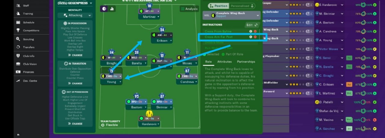 With this tactic, we enter the penalty area by playing from the vertical wings. If our midfielder wing on the right wing is the support of the right back, we will do a lot of thrusting on the right wing so that we can attack. Our midfielder on the left wing will act as an attacker and try to complete the middle from the thrusts on the right wing within the penalty area. Our offensive midfield will lead the attacks and create assists and goals with vertical passes. Therefore, we gave our offensive midfield instructions to take more risks and play vertically.