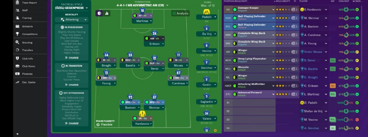 Our left-handed mezzala player will look for goals in and around the penalty area, along with the left-wing attack player. Our creative forward will cover more dribbles, thereby saving other attacking players. In order to be a more active and challenging team, most of our players were instructed to be harder in the interventions. Due to the wing-weighted game we play, our stoppers will stand out in the crowns and corners we will win and seek goals.