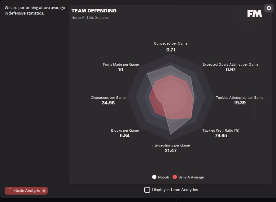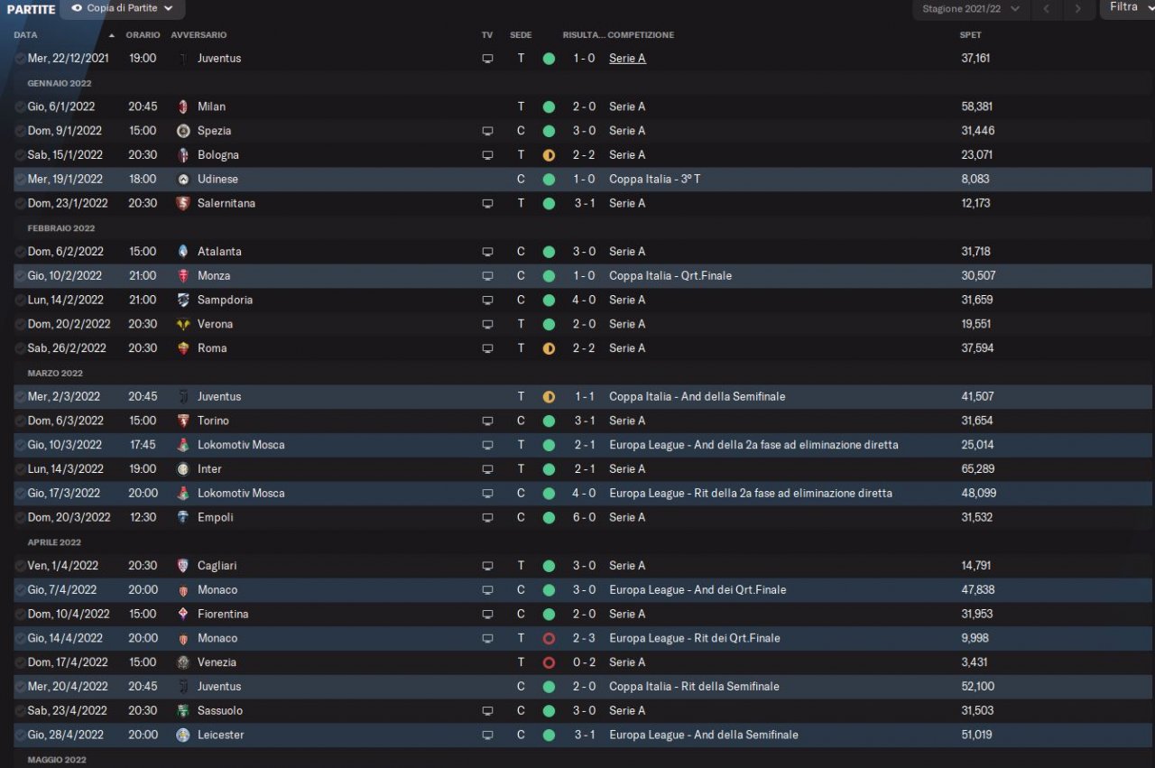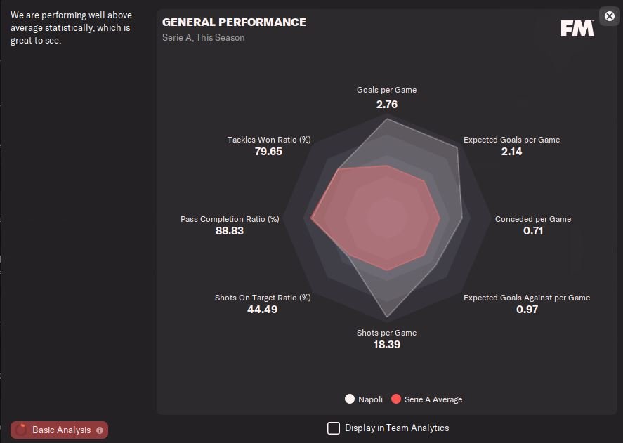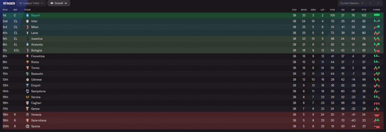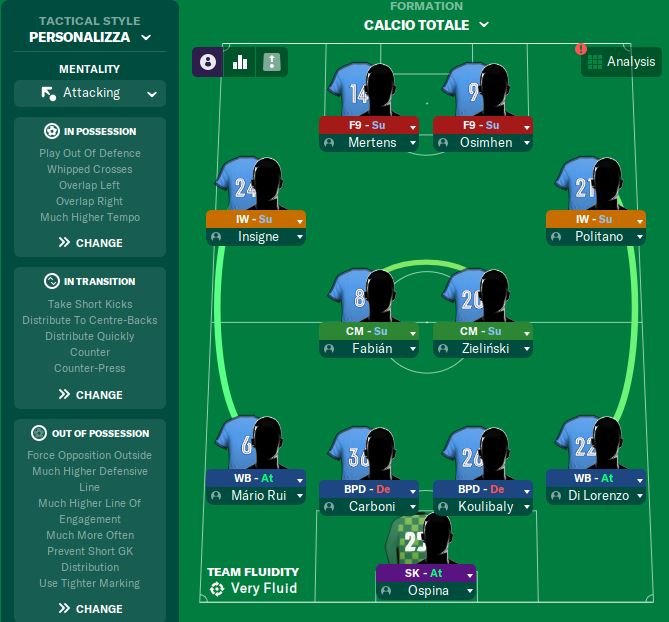 If we think of modern football, we think of something fluid made of movements without the ball and quick exchanges between players, we think of courageous defenses that climb forward to try to stifle the opponent's maneuver. I came up with this tactic trying to reproduce total football faithfully and I think I succeeded. No one is indispensable ALL are important. As you can see it is a tactic that scores everyone and not a tactic where the attackers score 80 goals in two. I played with Napoli, a good team but not excellent to play at the top in all competitions, towards the end of the season I made a lot of turnover to be able to face the cups in the best possible way since the championship was won many days in advance, I think with a more complete team and with the right players for each role can do even better. Most of the goals came early in the season where the team still had to learn tactics. Some games were lost due to large turnover (11/11). I am attaching as much data as possible and I will keep you updated waiting for the second season trying to make the transfer market and complete the squad. I also look forward to your feelings. Good fun