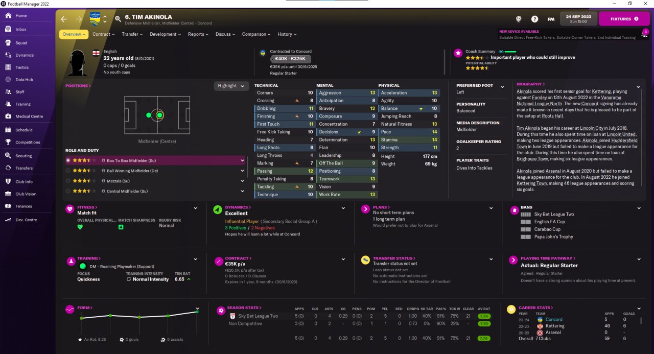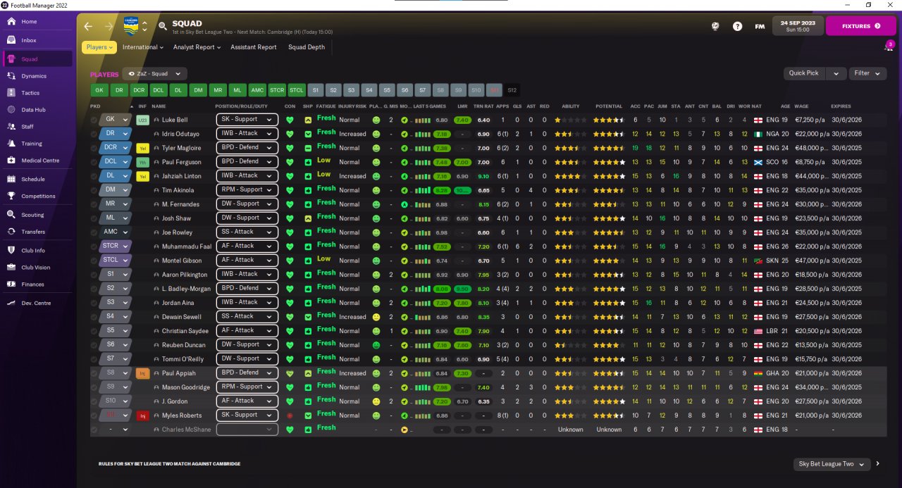 I have hired 8 new players, upgraded contract of 14 from last season to full time and sold (loaned out) everyone else. The new squad of 22 players has an annual cost of 586k euros, from ~360k from past season.