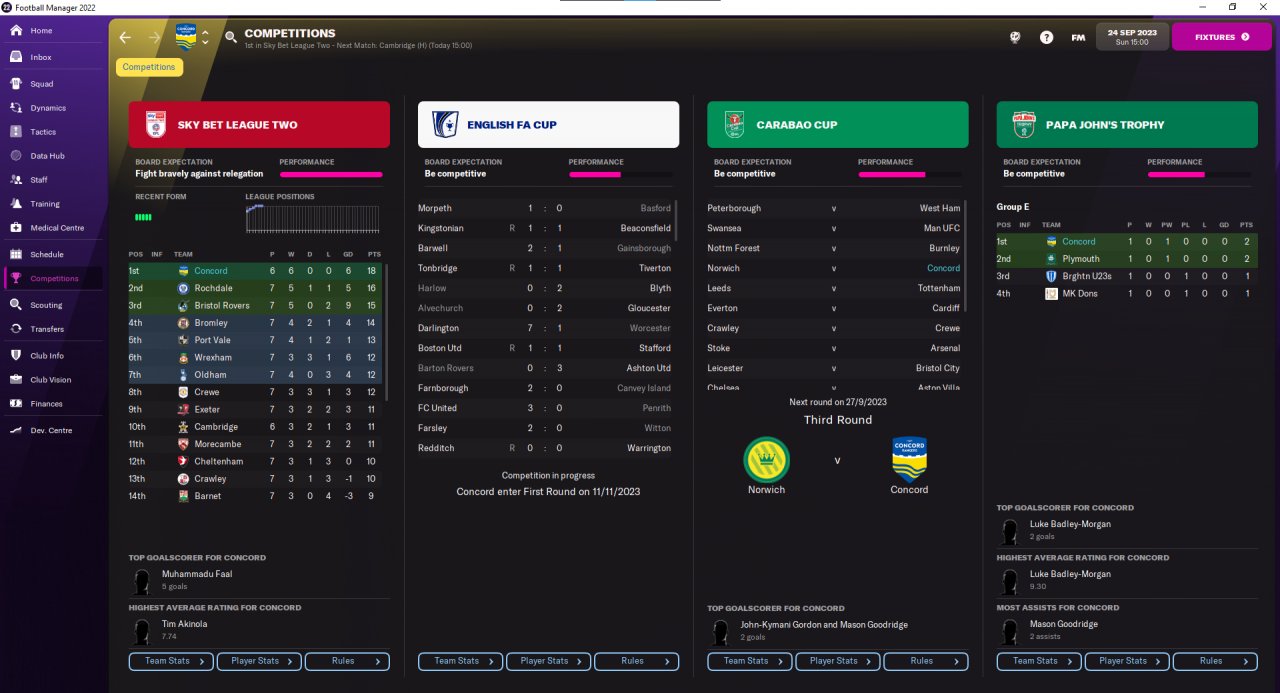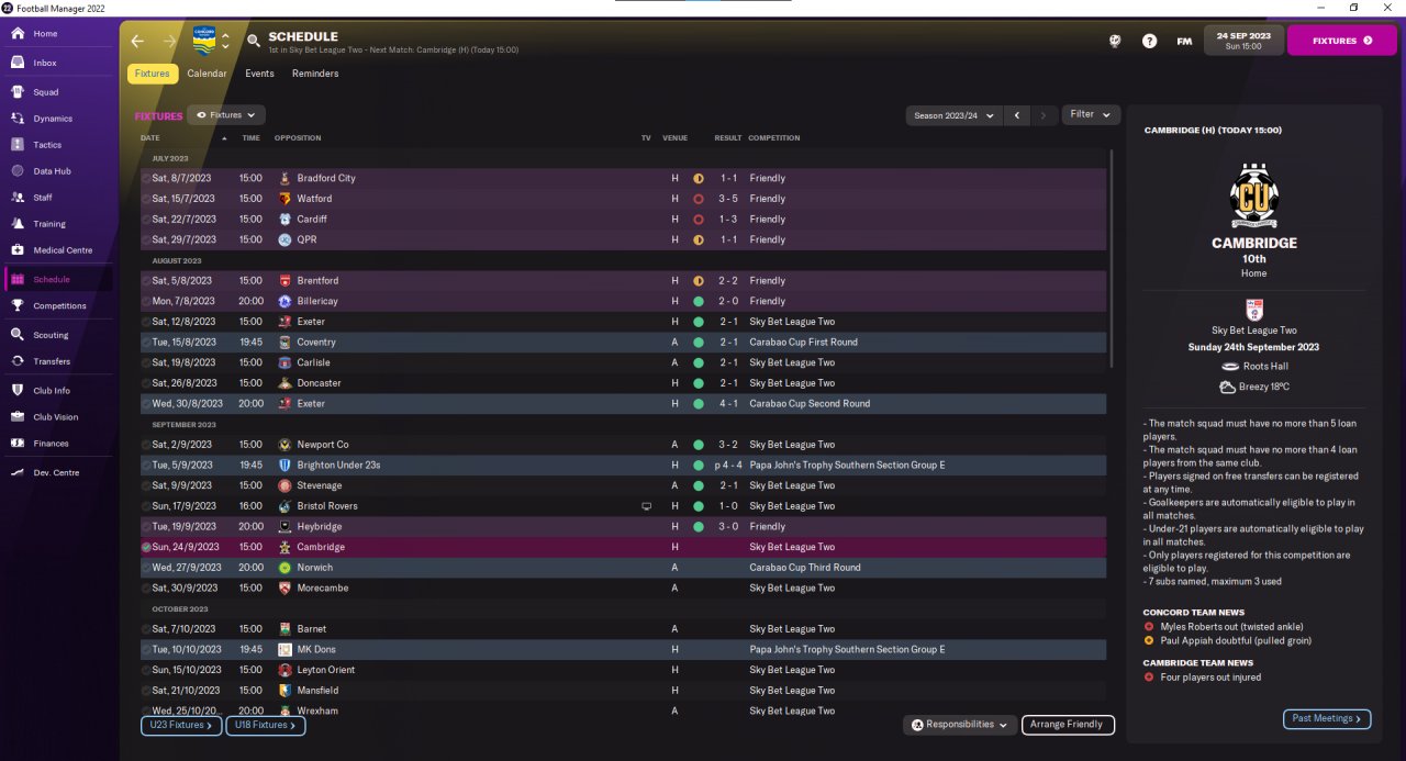 Season has been rather good this year. Other than pre-season cash grabbers, I have won all official matches. I'm rotating a lot, with second team playing Carabao Cup and Papa's John Trophy while main team focuses on the league. My initial goal is to earn 282k euros to get a positive balance projection, then I want to use any leftovers to start upgrading my facilities (still everything in the worst quality).
