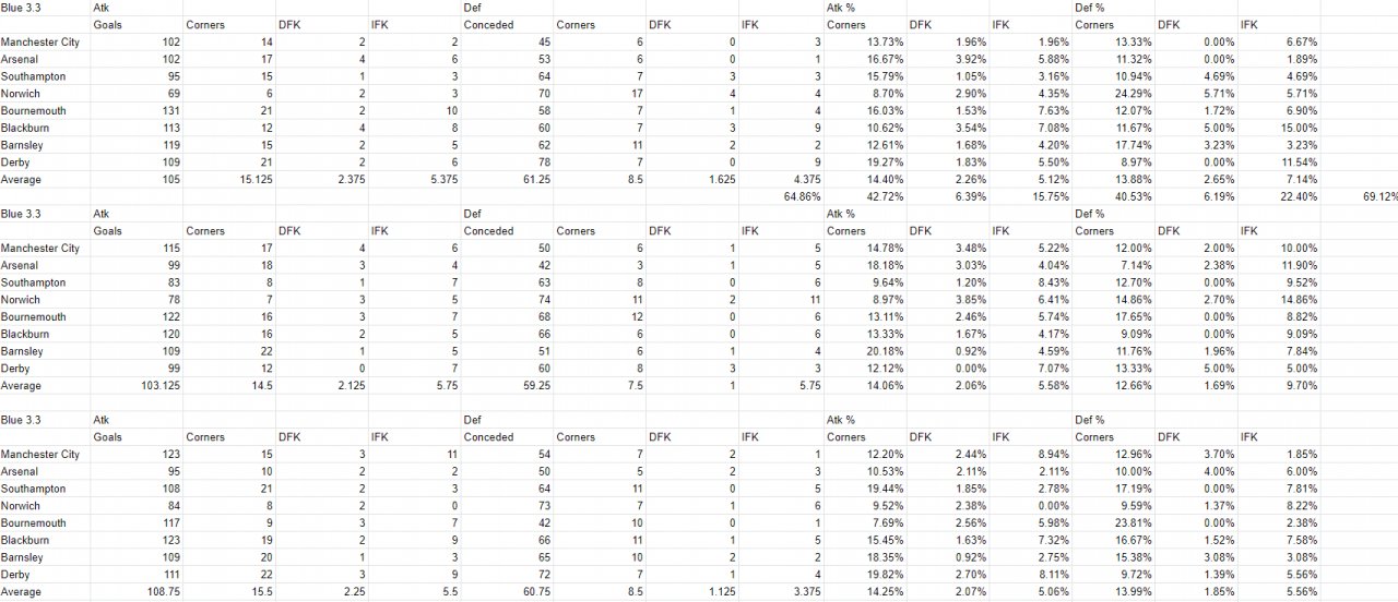 By the way, this is my data on my current set pieces. I'm currently trying to improve defensive set pieces as I'm happy with the attacking setup. I score around 21% of goals from set pieces, but concede around 23%, which is far from ideal.