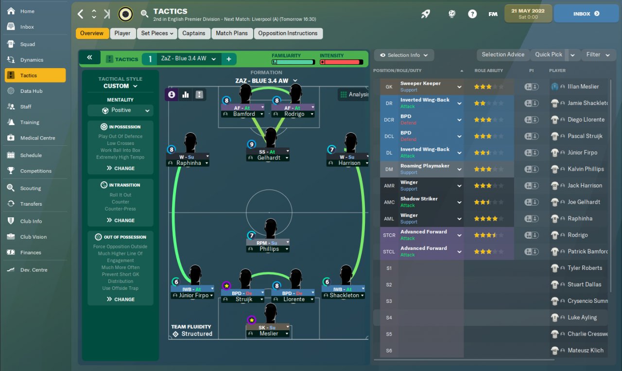 Blue DM for around 20 games then switched to 3.2 normal after that mate. I will change to 3.3 for my 1st season in the Prem league. Im hoping ive signed the right players to survive the prem relegation battle lol