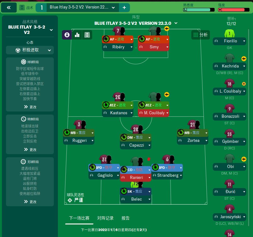 This is the V3 version of 352 formation of blue Italy, which has tested Liverpool, Fiorentina and Strasbourg! Both have achieved good results. Compared with V2, I boldly use the forward pressure of the back line to keep the three lines compact. Although it is easy for the other party to wear the ball behind sometimes under the current engine, the attack converted by the more forced pressure offsets the above concerns, and I give the team more freedom. In the three guard system, join the role of free man, the iconic figure of Italian tactics! It's wonderful to watch the 3D engine。I like this real, beautiful and successful style!