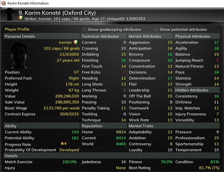 Hi @ZaZ , have you test on Flair atribute? after playing 8-10 seasons my best striker (according to genieScout with vkvkvk balanced) keep perform worst and worst even when genie scout rating keep increasing. I try to find out why, and i find out that his flair drop from 16 when he arrived to 10 after 8 years at club. i just recognized that if i kept training him as complete forward or advance forward, flair attribute will getting lower and lower. His average rating keep decrease from 7.88 first year to 7.60 at 7th year. I want him to win Ballondor so badly that i try to cheat by adding him as a corner taker to increase assist lol (and it work! he win it and rating become 7.88 since he assist 20+ per season, how ever his league goal keep decreasing TT)