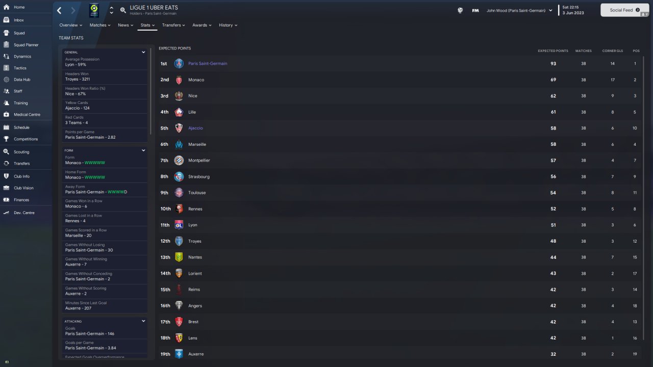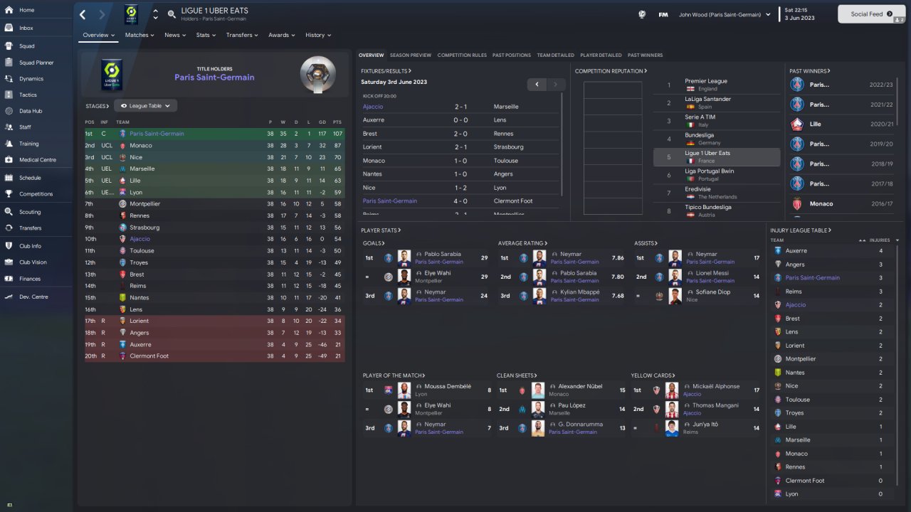 As you can see, PSG won the league by 20 points as they often do in these tests. However, Ajaccio finished 10th, a whole 10 places above their pre-season prediction. You will also notice the insane rout of PABLO SARABIA who ended with the golden boot from the AM position. I think Neymar would have won the golden boot if he had played as a shadow striker for the whole season, but he often played on the left.
