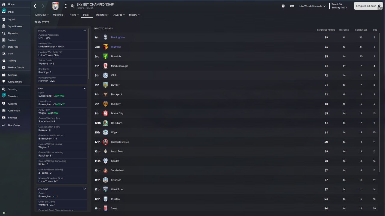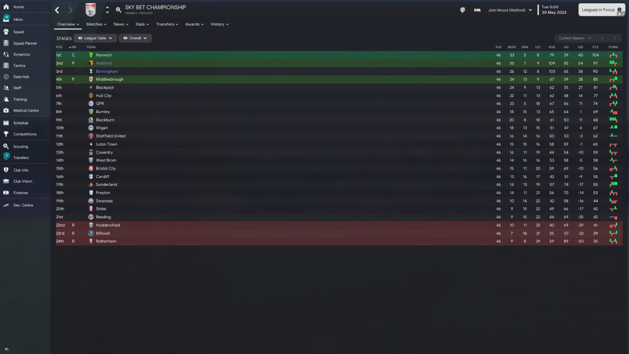 As you can see, Watford got automatic promotion on a respectable 97 points. However, Birmingham exceeded all expectations and managed a 3rd place finish. They lost to Boro in the playoff final