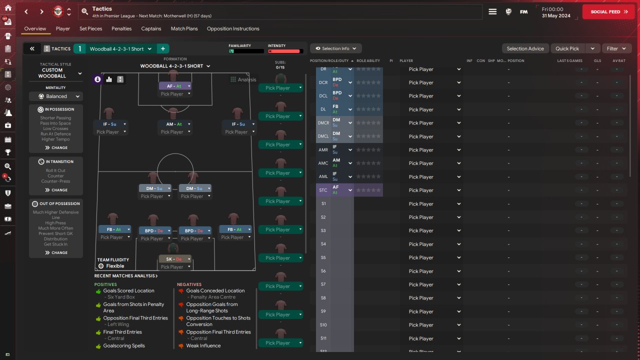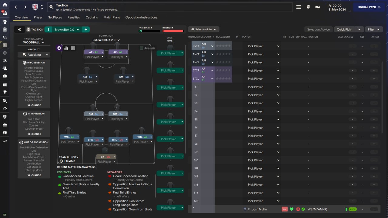 Revised the 4-2-3-1 which has been doing so well lately and made a few notable changes: - Run at defence - Focus on flanks - Overlaps Massive clean-up on player instructions as well, leaving dribble more only on defenders and also getting rid of the whole 'stay wider' and 'sit narrower' thing on the wings.