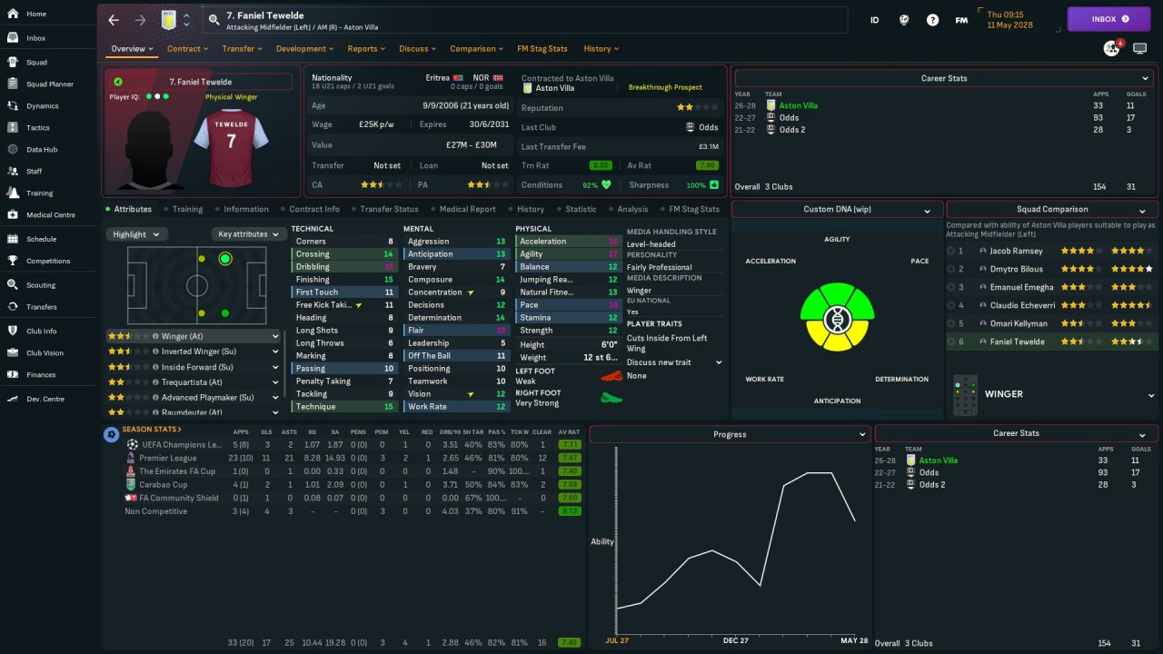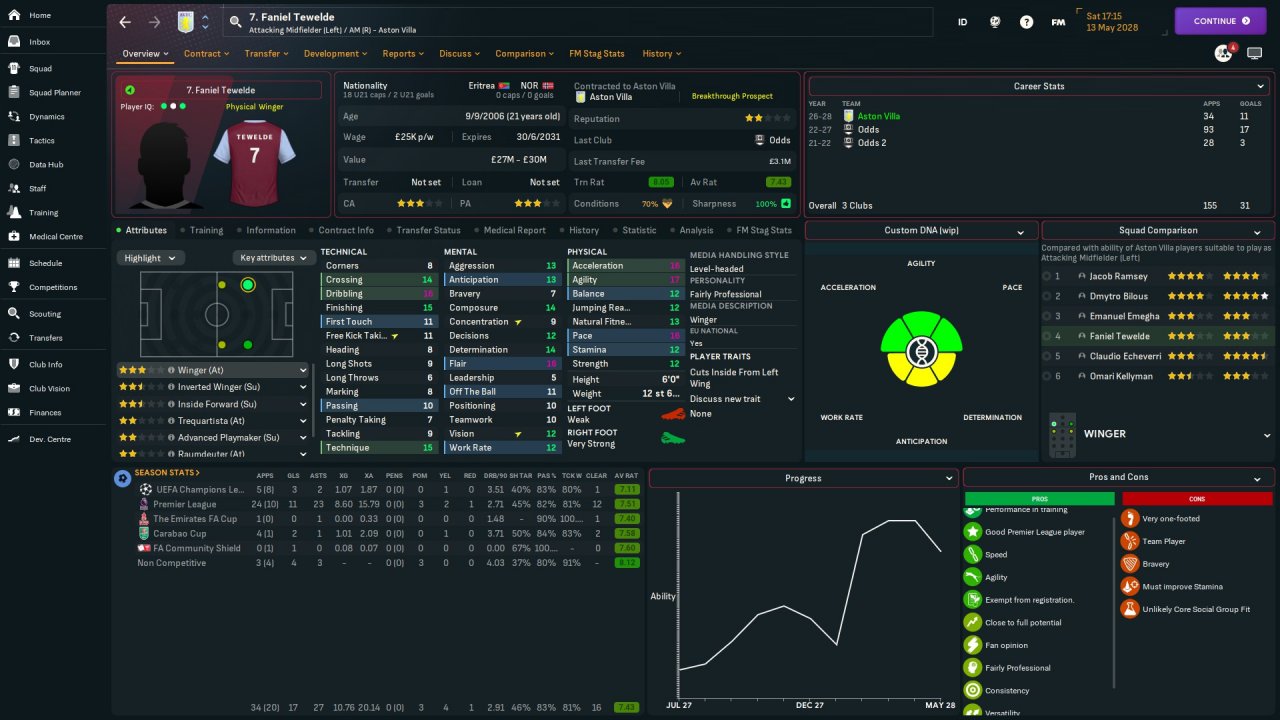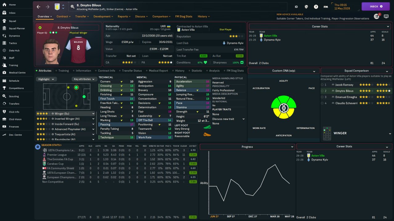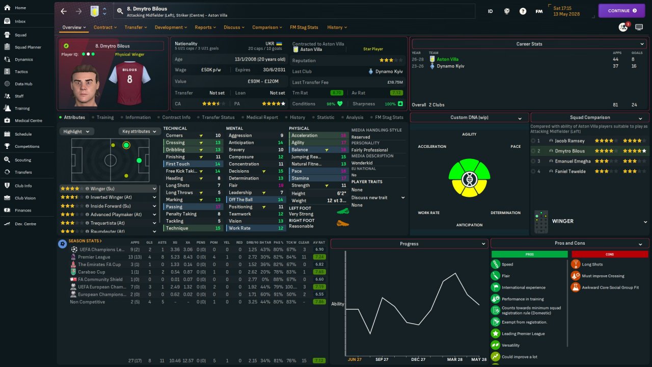 1. We can't see their pros and cons on this screen 2. Tewelde is a better dribbler 3. IWs tend to perform better on the opposite side to their feet. Bilous is left-footed and Tewelde is right-footed