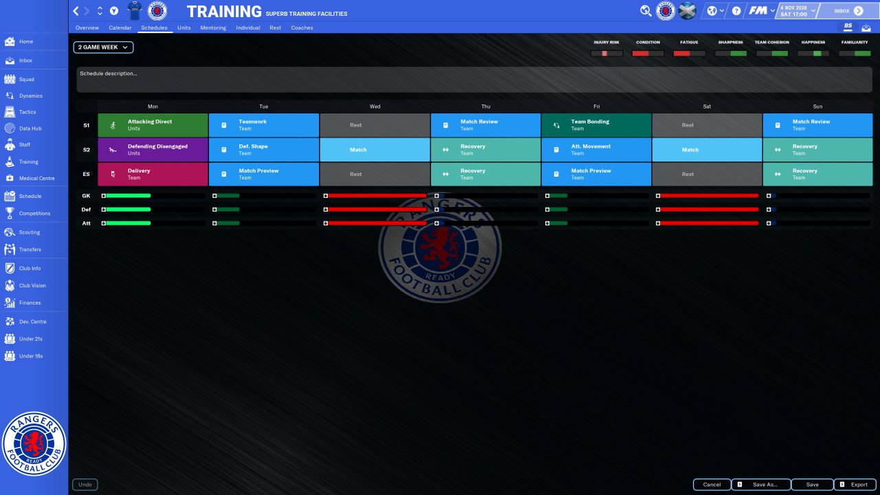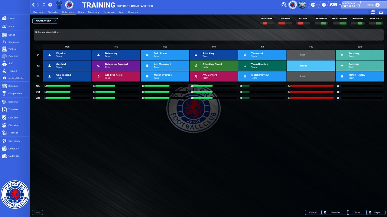 Training Schedules based upon ZaZ Rest is all "No pitch or gym work" except full condition which is normal intensity Players train by the role they play Additional work only after role has been learnt and after preseason Ignore all complaints