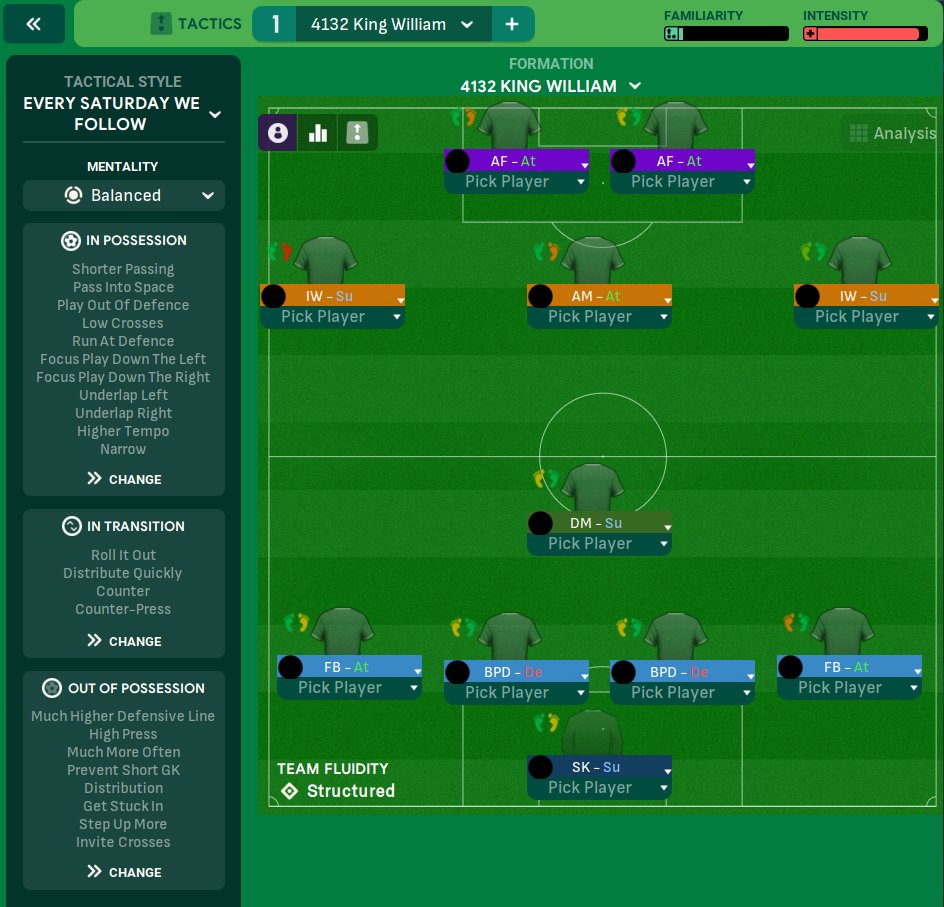 Modified from the UnderlapHeaven 1.2/Useless442 from durr/MemorizableUsername and based upon crizeKOS Superb results home and away with no OIs and no changing mentality etc as the schedule screenshot shows with the change to this formation mid season. IW preferably need to be strong on the opposite foot to that wing for obvious reasons but not too much of an issue if they are not.