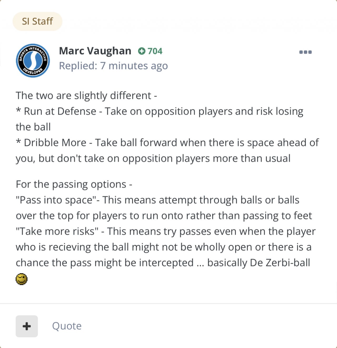 A little more content on "Run At Defence/Dribble More" and "Pass Into Space/Take More Risks" from SI's developer, Marc Vaughan.