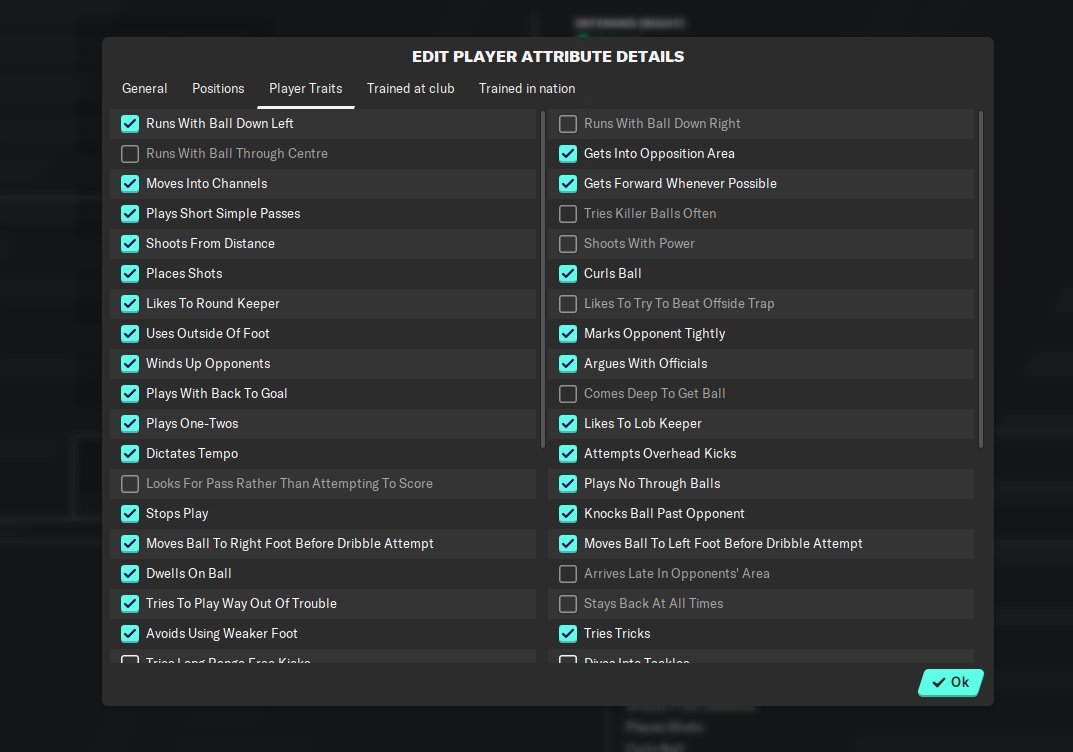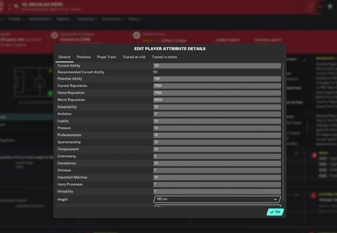 The difference between CA(Current Ability) and PA(Potential Ability) also have a great influence on the development rate so set the PA at the highest possible level(200)