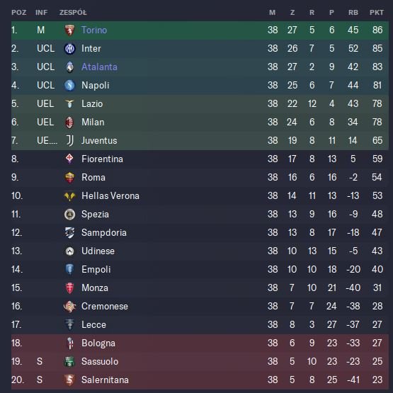This is my attempt to replicate the idea of Gasperini's Atalanta while adding Torino's mentality of defensive play. Last season Torino was the tightest team at the with exception of the top 4. This allowed them to upgrade from being a bottom table team in 18/19, 19/20 to a mid-table team. They also managed to win with Milan just recently, scoring 1:0 in the stoppage time, while having only 10 players on the pitch for the last 50 minutes. Out of 33(!) Milans attempts only 8 were on target.