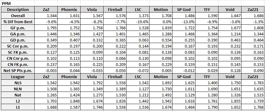 Ignoring points per match and looking only at the % of goals by each set piece, we have the following best set pieces: - Attacking Direct Free Kicks: Blue 2.0 - Attacking Corners: Motion (contested by Phoenix and Blue 2.0) - Attacking Indirect Free Kicks: Blue 2.0 - Attacking Throw-ins: None - Defensive Direct Free Kicks: Motion - Defensive Corners: Void (contested by Phoenix and Motion) - Defensive Indirect Free Kicks: Phoenix - Defensive Throw-ins: All