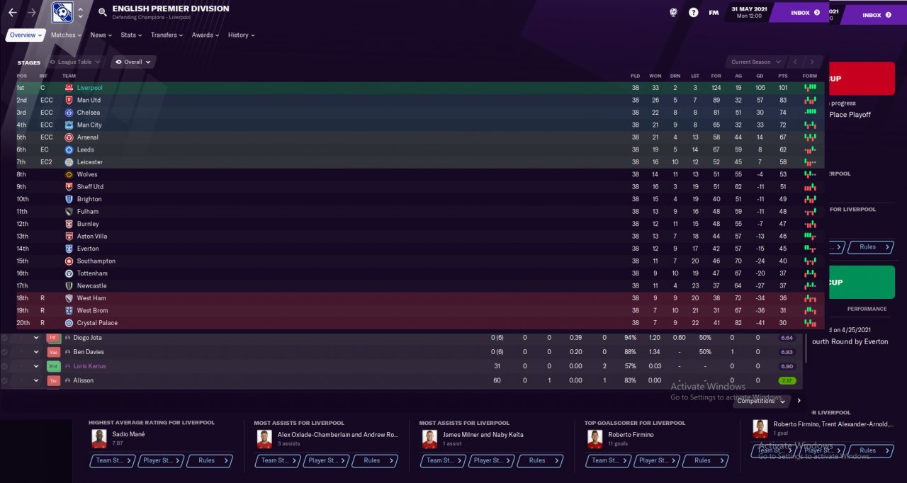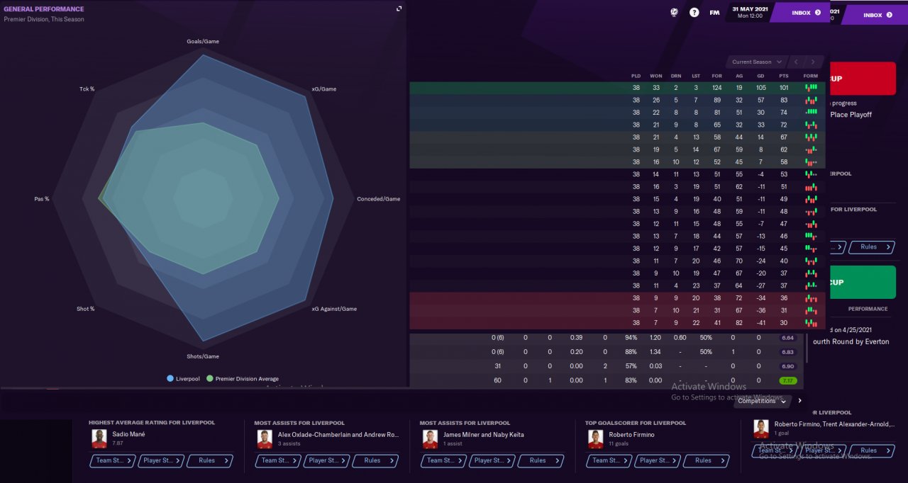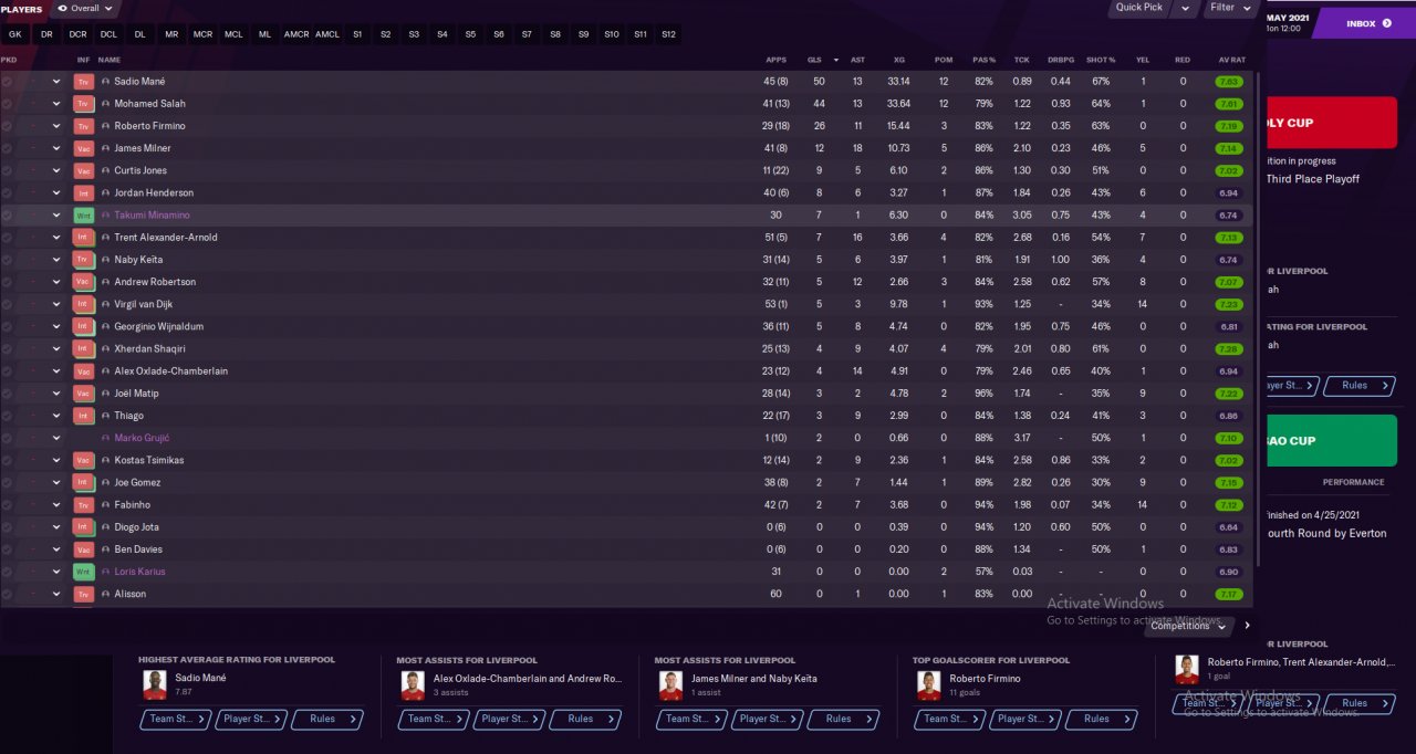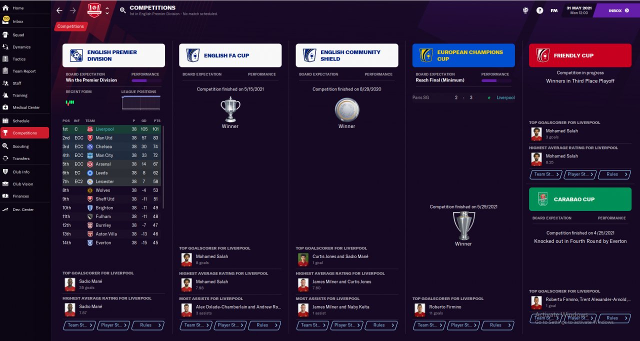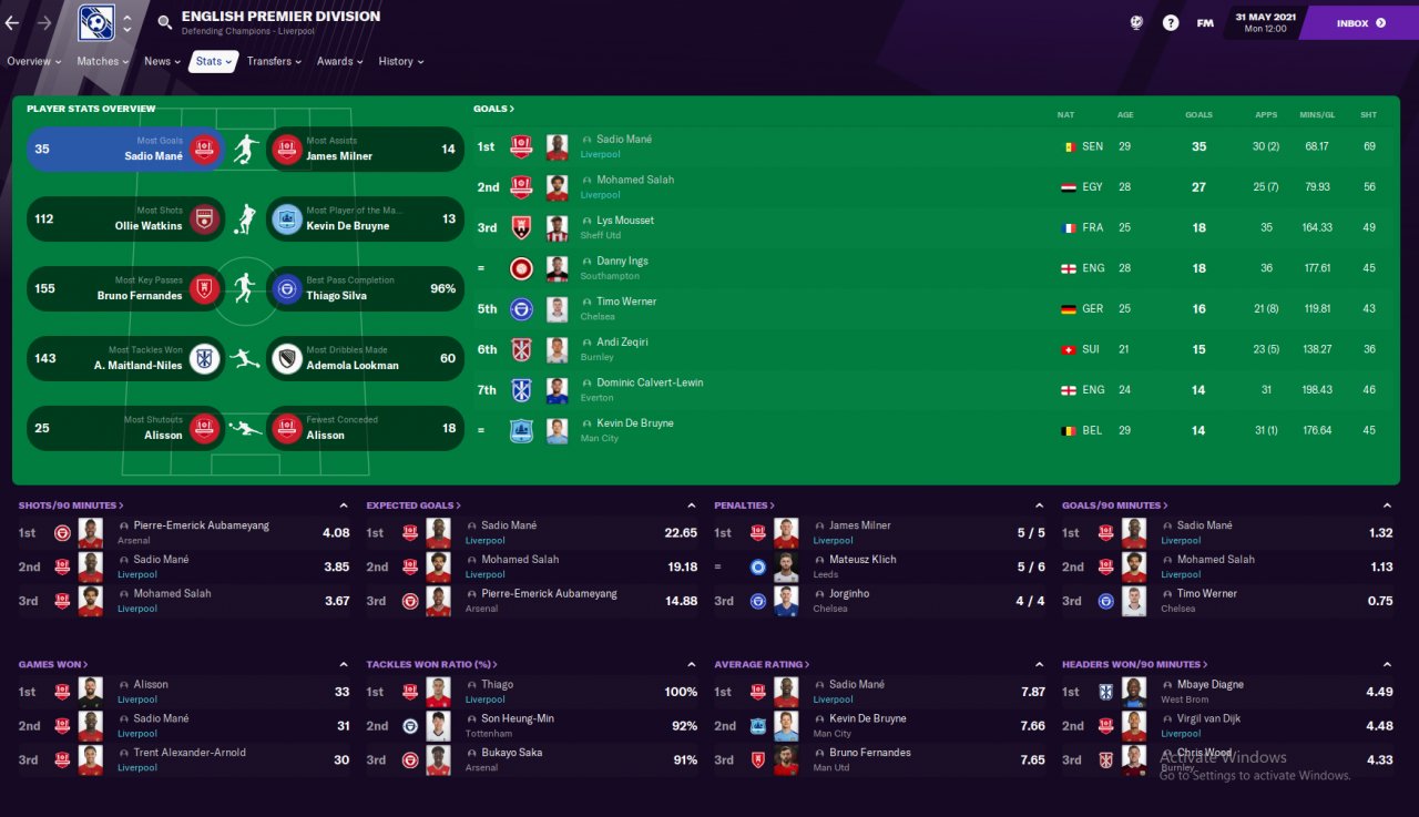 Did a holiday test mode with Liverpool, which we won EPL, FA CUP and Champion leagues. Mane scored 35 while Salah got 27 in the league.