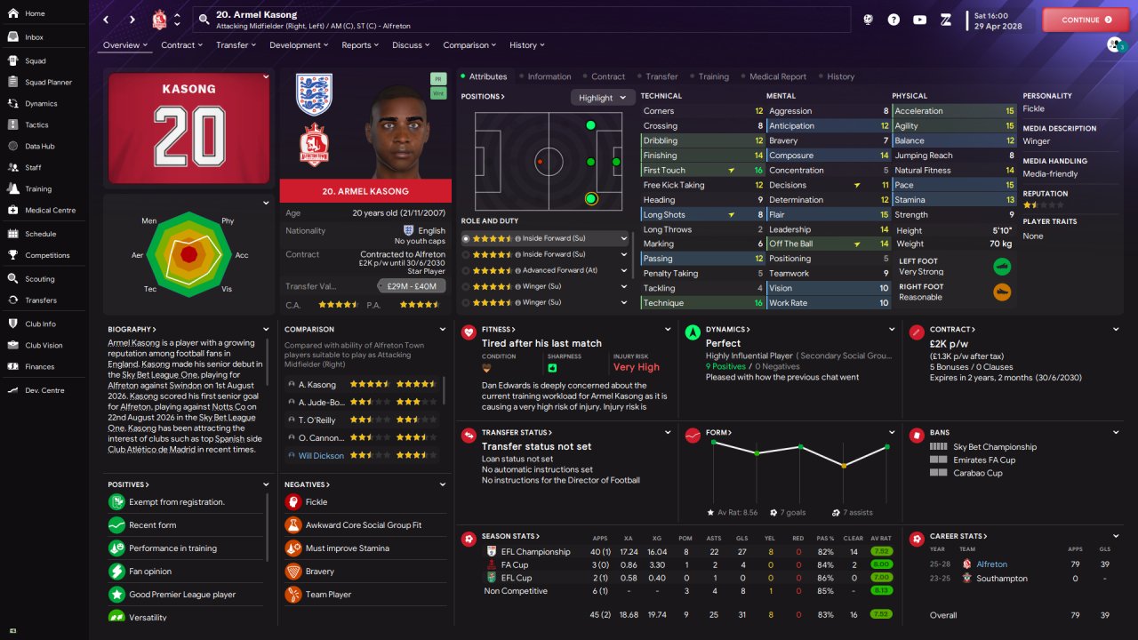 I did manage to find an absolute world-beater who was released from a premier league youth team. He just kept improving and became premier league standard this season. I promised him a move if his price tag was met and then his price tag just kept getting higher and higher. We had a chance at promotion so i told him he was staying which he didn't like but he always played to his best regardless.